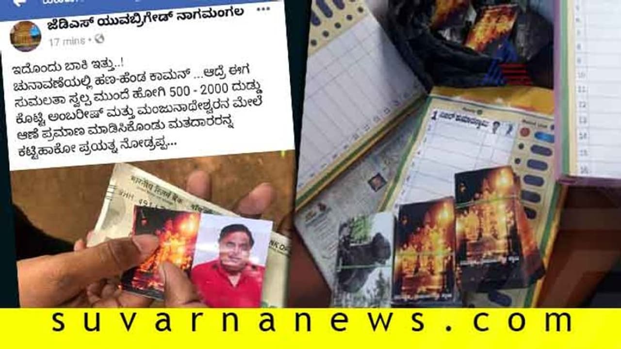 ಮತದಾರರನ್ನು ಕಟ್ಟಿ ಹಾಕಲು ಮಂಡ್ಯದಲ್ಲಿ ಆಣೆ ಪ್ರಮಾಣದ ಗಿಮಿಕ್ ನಡೆಯುತ್ತಿದೆ ಎಂಬ ಪೋಟೋಗಳು ಸಾಮಾಜಿಕ ಜಾಲತಾಣದಲ್ಲಿ ಹರಿದಾಡುತ್ತಿವೆ.