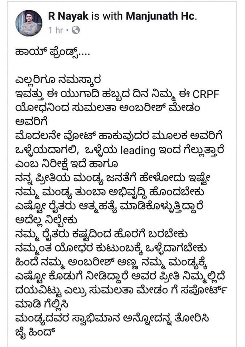 ಸಿಆರ್ ಪಿಎಫ್ ಯೋಧರೊಬ್ಬರು ಮಂಡ್ಯದ ಪಕ್ಷೇತರ ಅಭ್ಯರ್ಥಿ ಸುಮಲತಾ ಅಂಬರೀಶ್ ಗೆ ಮತ ಹಾಕಿದ್ದು ಇದೇ ರೀತಿ ಪ್ರತಿಯೊಬ್ಬರು ಮಾಡಿ ಮಂಡ್ಯದ ಸ್ವಾಭಿಮಾನ ಕಾಪಾಡಬೇಕು ಎಂದು ಆರ್ ನಾಯಕ್ ಎಂಬುವರು ಫೇಸ್ ಬುಕ್ ನಲ್ಲಿ ಹಂಚಿಕೊಂಡಿದ್ದನ್ನು ಸುಮಲತಾ ತಮ್ಮ ವಾಲ್ ನಲ್ಲಿ ಶೇರ್ ಮಾಡಿ ಮೇಲಿನಂತೆ ಬರೆದಿದ್ದಾರೆ.