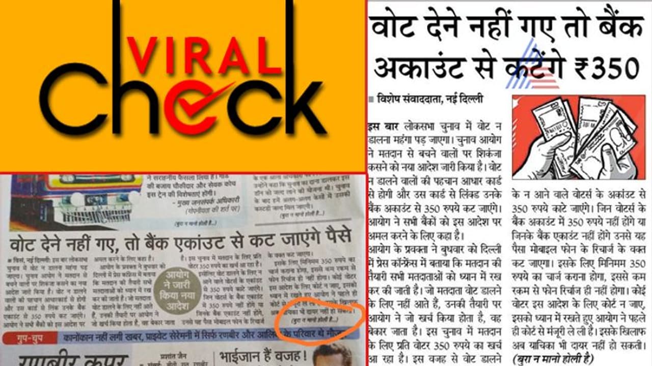 ಲೋಕಸಭಾ ಚುನಾವಣೆಯಲ್ಲಿ ಮತ ಚಲಾಯಿಸದಿದ್ದರೆ, ನಿಮ್ಮ ಬ್ಯಾಂಕ್ ಖಾತೆಯಿಂದ 350 ರು. ಹಣ ಕಡಿತಗೊಳಿಸಲಾಗುತ್ತದೆ ಎಂಬ ಸಂದೇಶ ಹರಿದಾಡುತ್ತಿದೆ. ಇದು ನಿಜಾನಾ? ಇಲ್ಲಿದೆ ಸುದ್ದಿ ಹಿಂದಿನ ಸತ್ಯಾಸತ್ಯತೆ