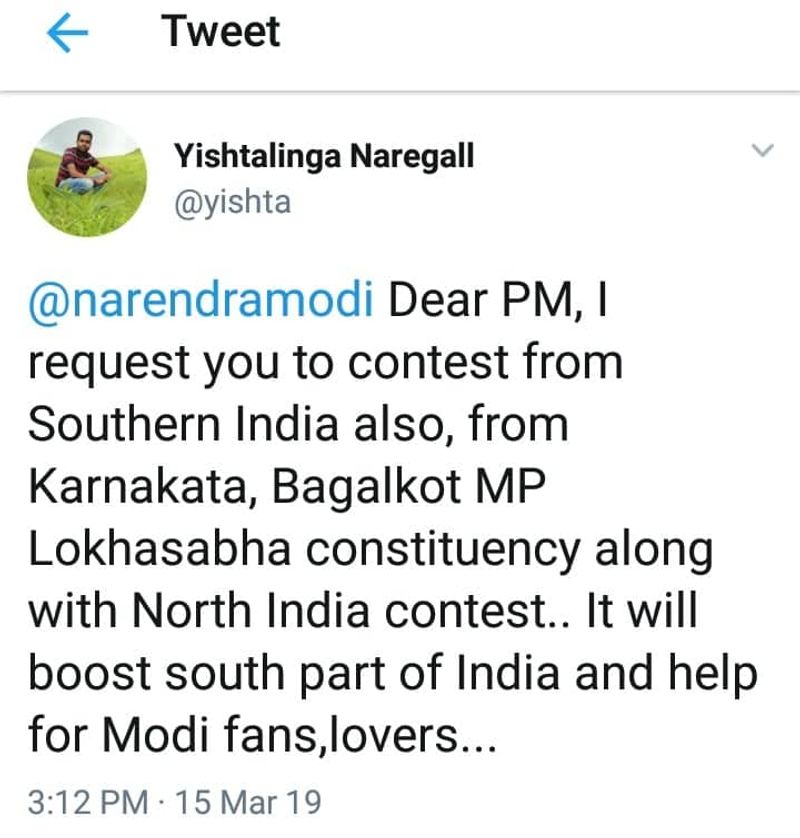 ಬಾಗಲಕೋಟೆ ಜಿಲ್ಲೆಯ ಬಾದಾಮಿಯ ನಿವಾಸಿ ಇಷ್ಟಲಿಂಗ ಟ್ವೀಟ್ ಮಾಡಿದ್ದು, ಉತ್ತರ ಭಾರತದ ಜೊತೆಗೆ ದಕ್ಷಿಣ ಭಾರತದಲ್ಲೂ ಪ್ರಧಾನಿ ಮೋದಿ ಸ್ಫಧೆ೯ ಮಾಡಲಿ ಈ ಮೂಲಕ ದಕ್ಷಿಣ ಭಾರತದ ಮೋದಿಯವರ ಅಭಿಮಾನಿಗಳಿಗೆ ಚೈತನ್ಯದ ಜೊತೆಗೆ ಇನ್ನಷ್ಟು ಬಲ ಸಿಗಲಿದೆ. ಹೀಗಾಗಿ ಬಾಗಲಕೋಟೆಯಿಂದ ಮೋದಿಯವರು ಸ್ಫಧೆ೯ ಮಾಡಲಿ ಎಂದು ಕೇಳಿಕೊಂಡಿದ್ದಾರೆ.