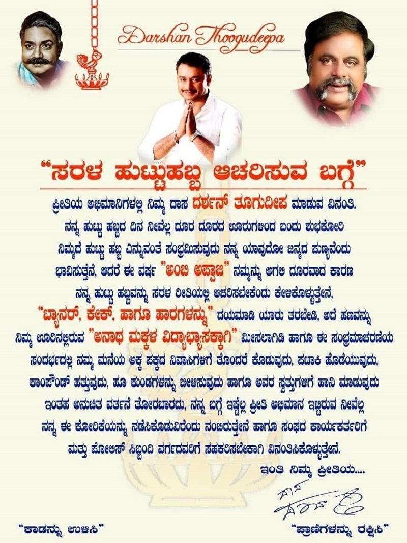 ಆ ಪತ್ರದ ಮಧ್ಯದಲ್ಲಿ ದರ್ಶನ್ ಮುಖವಿದ್ದು, ಅಕ್ಕಪಕ್ಕದಲ್ಲಿ ತಂದೆ ತೂಗೂದೀಪ್ ಹಾಗೂ ಅಂಬರೀಷ್ ಫೋಟೋಗಳನ್ನು ಲಗತ್ತಿಸಲಾಗಿದೆ.