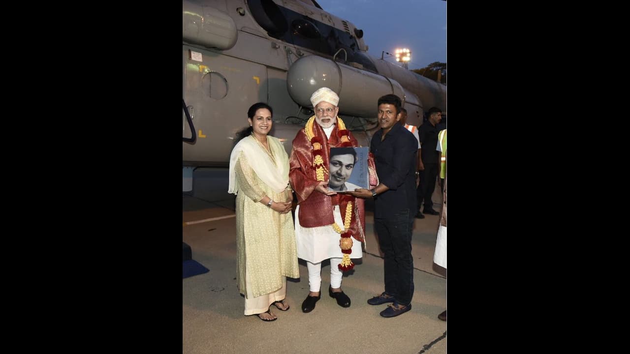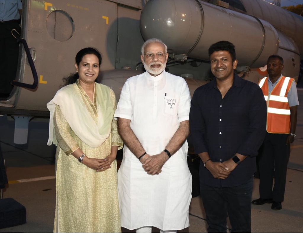 ಸ್ಯಾಂಡಲ್ವುಡ್ ನಟ ಪುನೀತ್ ರಾಜ್ಕುಮಾರ್, ಪತ್ನಿಯೊಂದಿಗೆ ಎಚ್ಎಎಲ್ ಏರ್ಪೋರ್ಟ್ನಲ್ಲಿ ಪ್ರಧಾನಿ ನರೇಂದ್ರ ಮೋದಿ ಅವರನ್ನು ಭೇಟಿಯಾಗಿ ಡಾ.ರಾಜ್ ಜೀವನ ಚರಿತ್ರೆಯನ್ನು ಉಡುಗೊರೆಯಾಗಿ ನೀಡಿದರು. ಇದೊಂದು ಸೌಹಾರ್ದ ಭೇಟಿ ಎಂದು ಹೇಳಲಾಗಿದೆ.