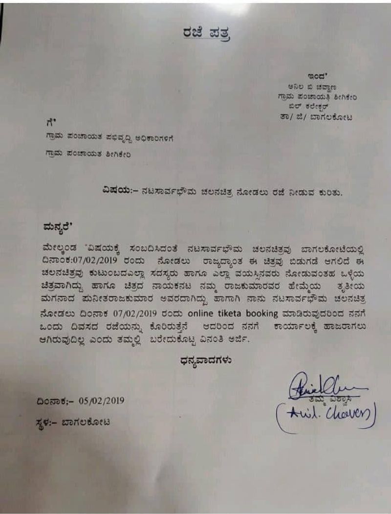 ಬಾಗಲಕೋಟೆ ಜಿಲ್ಲೆಯ ಶೀಗಿಕೇರಿ ಗ್ರಾಮ ಪಂಚಾಯತಿ ಬಿಲ್ ಕಲೆಕ್ಟರ್ ಕುಟುಂಬ ಸಮೇತ ಚಿತ್ರ ನೋಡಲು ಅವಕಾಶ ಕೋರಿ ಪಿಡಿಓಗೆ ರಜೆ ಪತ್ರ ಬರೆದಿದ್ದಾರೆ ಅನಿಲ್ ಚವ್ಹಾಣ ಎಂಬುವರು ಸಿನಿಮಾ ವೀಕ್ಷಣೆಗೆ ರಜೆ ಕೇಳಿದ್ದಾರೆ.