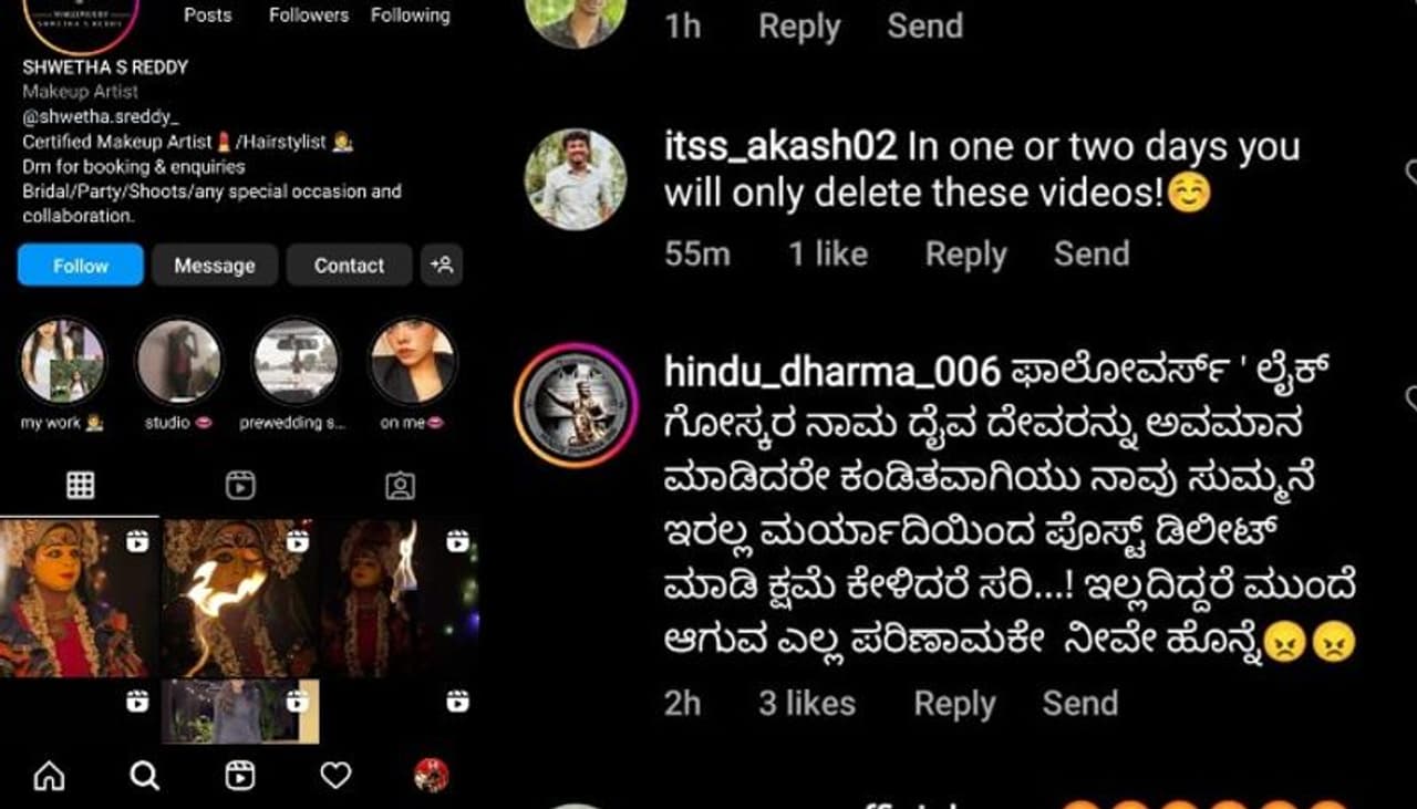 ಇನ್ನು ಫಾಲೋವರ್ಸ್ ಲೈಕ್ ಗೋಸ್ಕರ ನಮ್ಮ ದೈವ ದೇವರನ್ನು ಅವಮಾನ ಮಾಡಿದರೇ ಕಂಡಿತವಾಗಿಯು ನಾವು ಸುಮ್ಮನೆ ಇರಲ್ಲ, ಮರ್ಯಾದಿಯಿಂದ ಪೊಸ್ಟ್ ಡಿಲೀಟ್ ಮಾಡಿ ಕ್ಷಮೆ ಕೇಳಿದರೆ ಸರಿ…! ಇಲ್ಲದಿದ್ದರೆ ಮುಂದೆ ಆಗುವ ಎಲ್ಲ ಪರಿಣಾಮಕೇ ನೀವೇ ಹೊಣೆ" ಎಂದು ಮತ್ತೊಬ್ಬರು ಪೋಸ್ಟ್ ಮಾಡಿದ್ದಾರೆ. ಸಾಮಾಜಿಕ ಜಾಲತಾಣಗಳಲ್ಲಿ ಆಕ್ರೋಶದ ಬಳಿಕ ಯುವತಿ ಇನ್ಸ್ಟಾಗ್ರಾಮ್ ಖಾತೆಯಿಂದ ರೀಲ್ಸ್ಗಳನ್ನು ಡಿಲೀಟ್ ಮಾಡಿದ್ದಾಳೆ.
