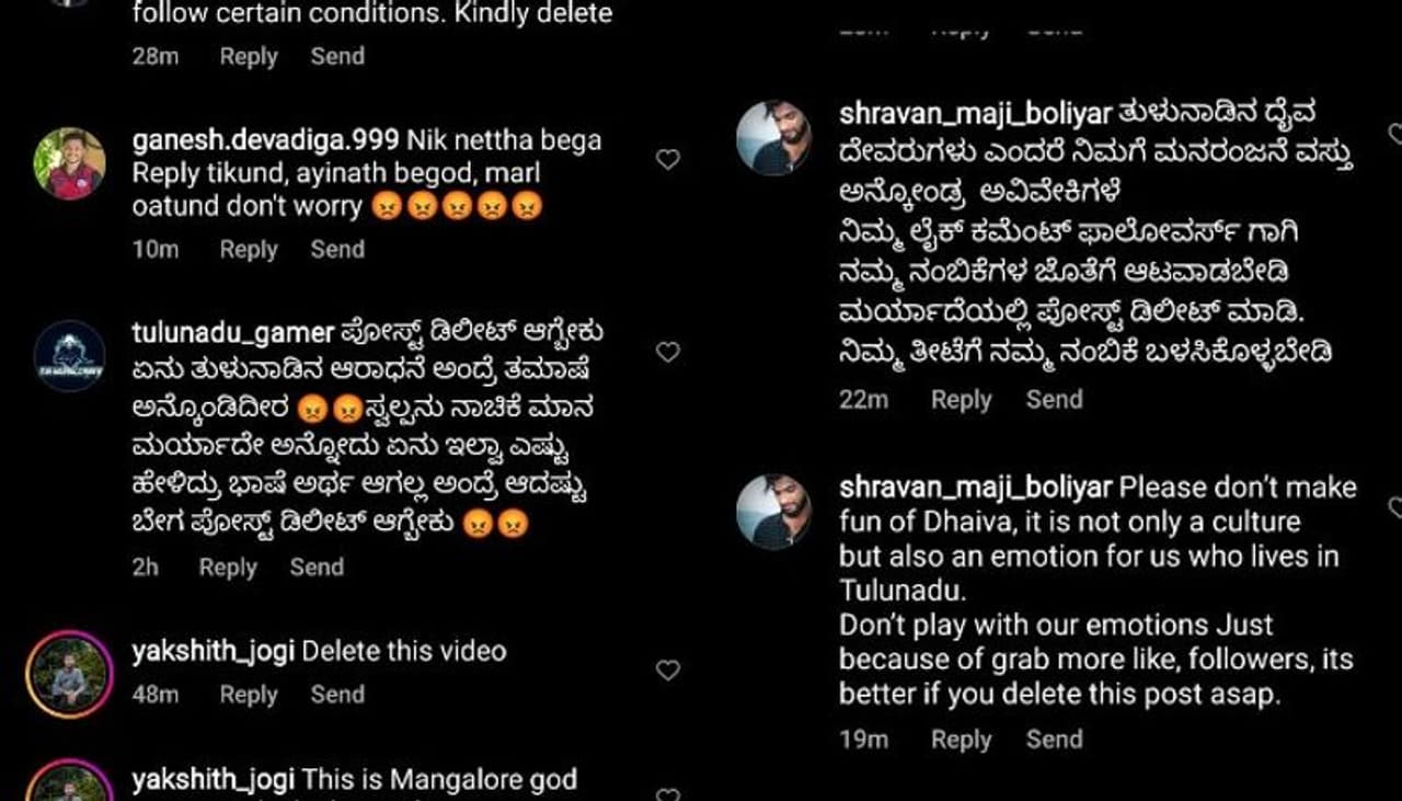 ಸಾಮಾಜಿಕ ಜಾಲತಾಣಗಳಲ್ಲಿ ಆಕ್ರೋಶ: "ತುಳುನಾಡಿನ ದೈವ ದೇವರುಗಳು ಎಂದರೆ ನಿಮಗೆ ಮನರಂಜನೆ ವಸ್ತು ಅನ್ಕೋಂಡ್ರ ಅವಿವೇಕಿಗಳೆ, ನಿಮ್ಮ ಲೈಕ್ ಕಮೆಂಟ್ ಫಾಲೋವರ್ಸ್ ಗಾಗಿ ನಮ್ಮ ನಂಬಿಕೆಗಳ ಜೊತೆಗೆ ಆಟವಾಡಬೇಡಿ ಮರ್ಯಾದೆಯಲ್ಲಿ ಪೋಸ್ಟ್ ಡಿಲೀಟ್ ಮಾಡಿ. ನಿಮ್ಮ ತೀಟೆಗೆ ನಮ್ಮ ನಂಬಿಕೆ ಬಳಸಿಕೊಳ್ಳಬೇಡಿ" ಎಂದು ಬಳಕೆದಾರರೊಬ್ಬರು ಕಾಮೆಂಟ್ ಮಾಡಿದ್ದಾರೆ.