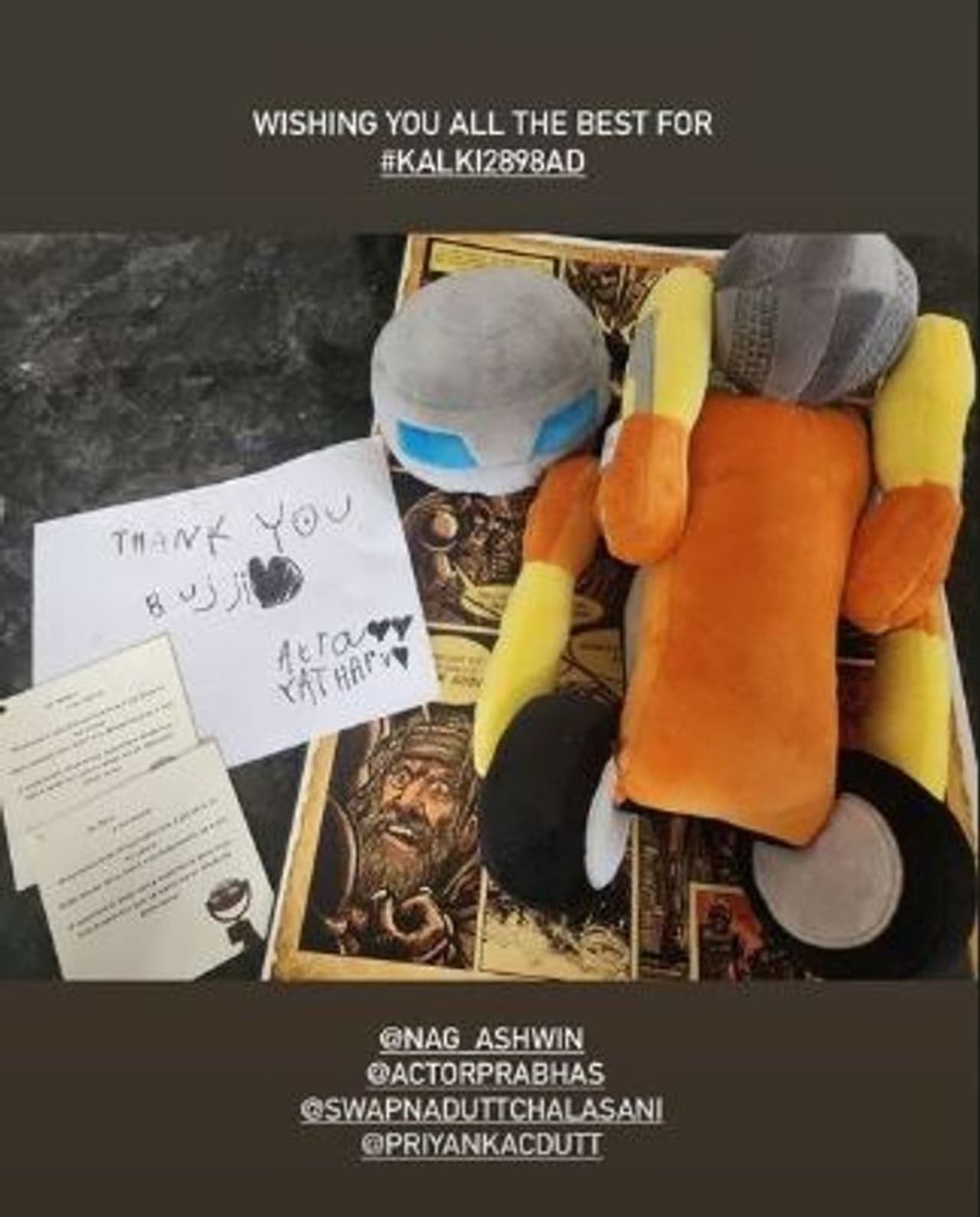 ಕಲ್ಕಿ ಸಿನಿಮಾ ತಂಡ ಕಳುಹಿಸಿರುವ ಗಿಫ್ಟ್ ಫೋಟೋವನ್ನು ರಾಧಿಕಾ ಪಂಡಿತ್ (Actress Radhika Pandit) ಸೋಶಿಯಲ್ ಮೀಡಿಯಾ ಖಾತೆಯಲ್ಲಿ ಶೇರ್ ಮಾಡಿಕೊಂಡು ಧನ್ಯವಾದಗಳನ್ನು ಸಲ್ಲಿಸಿದ್ದಾರೆ. ಐರಾ ಮತ್ತು ಯಥರ್ವ್ಗೆ ಕಲ್ಕಿ ಟಾಯ್ ಬಂದು ಸೇರಿದೆ. ಇಬ್ಬರು ಮಕ್ಕಳು ಥ್ಯಾಂಕ್ ಯು ಬುಜ್ಜಿ ಎಂದು ಬರೆದಿರುವ ನೋಟ್ ಸಹ ರಾಧಿಕಾ ಪಂಡಿತ್ ಹಂಚಿಕೊಂಡಿದ್ದಾರೆ.
