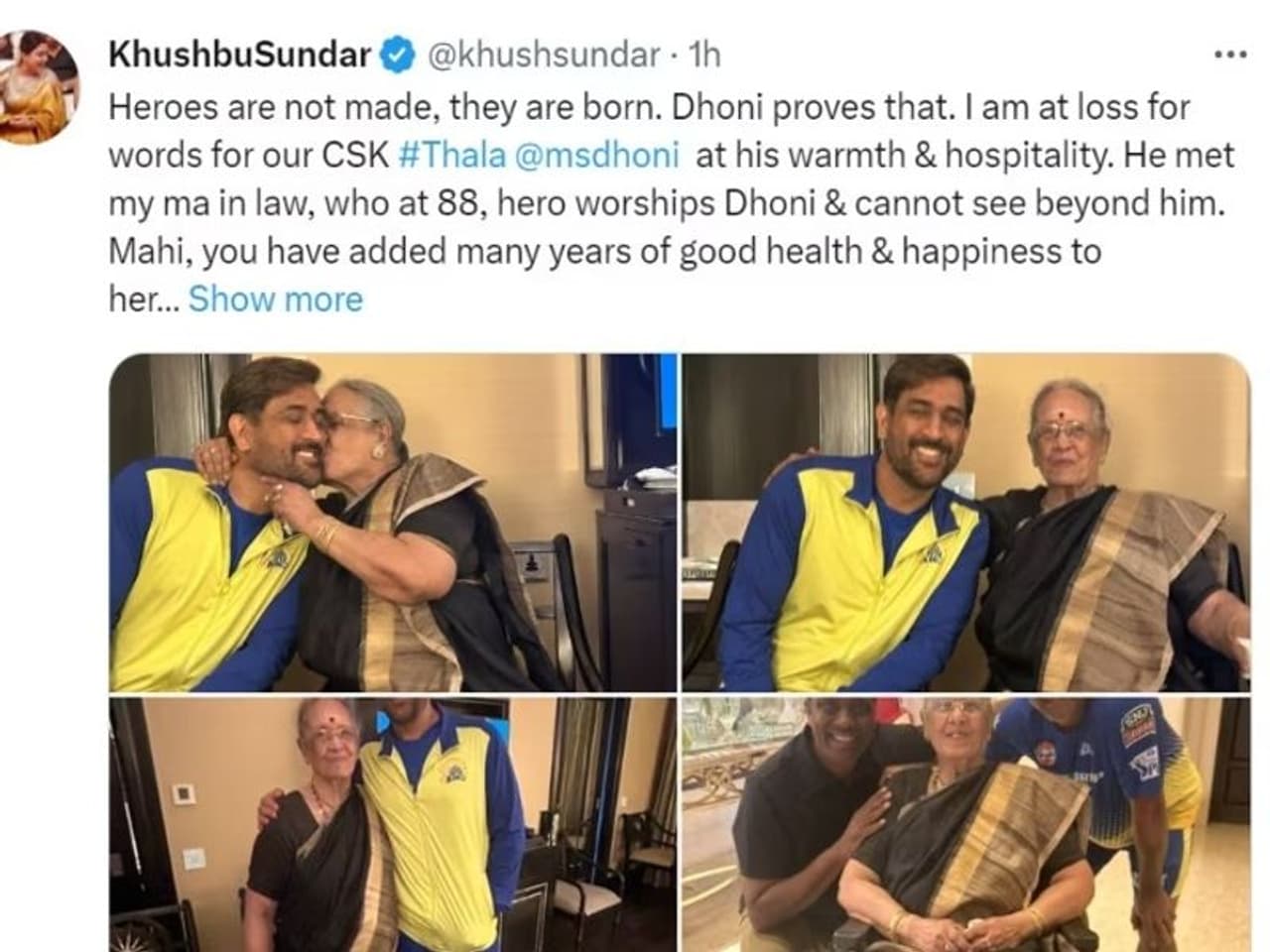 88 ವರ್ಷದ ತನ್ನ ಅತ್ತೆಯನ್ನು ಎಂಎಸ್ ಧೋನಿ ಇಂದು ಭೇಟಿಯಾದರು. ಮಹೀ, ನೀವು ಅವರ ಜೀವನಕ್ಕೆ ಇನ್ನಷ್ಟು ಅರೋಗ್ಯ ಹಾಗೂ ಸಂತೋಷವನ್ನು ತುಂಬಿದ್ದೀರಿ ಎಂದು ಖುಷ್ಬೂ ತಮ್ಮ ಸೋಶಿಯಲ್ ಮೀಡಿಯಾ ಪೋಸ್ಟ್ನಲ್ಲಿ ಬರೆದುಕೊಂಡಿದ್ದಾರೆ.