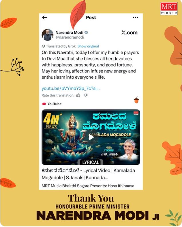 ನಮ್ಮ ದೇಶದ ಹೆಮ್ಮೆಯ ಪ್ರಧಾನಿ ಶ್ರೀ ನರೇಂದ್ರ ಮೋದಿಯವರು ನಮ್ಮ MRT ಸಂಸ್ಥೆಯಲ್ಲಿರುವ ಎಸ್ ಜಾನಕಿ ಅವರು ಹಾಡಿರುವ ಕಮಲದ ಮೊಗದೋಳೆ ಹಾಡಿಗೆ ಮನಸೋತು ತಮ್ಮ x ಖಾತೆಯಲ್ಲಿ ಹಂಚಿಕೊಂಡು ದೇಶದ ಜನತೆಗೆ ನವರಾತ್ರಿಯ ಶುಭಾಶಯವನ್ನು ಕೋರಿದ್ದಾರೆ.
