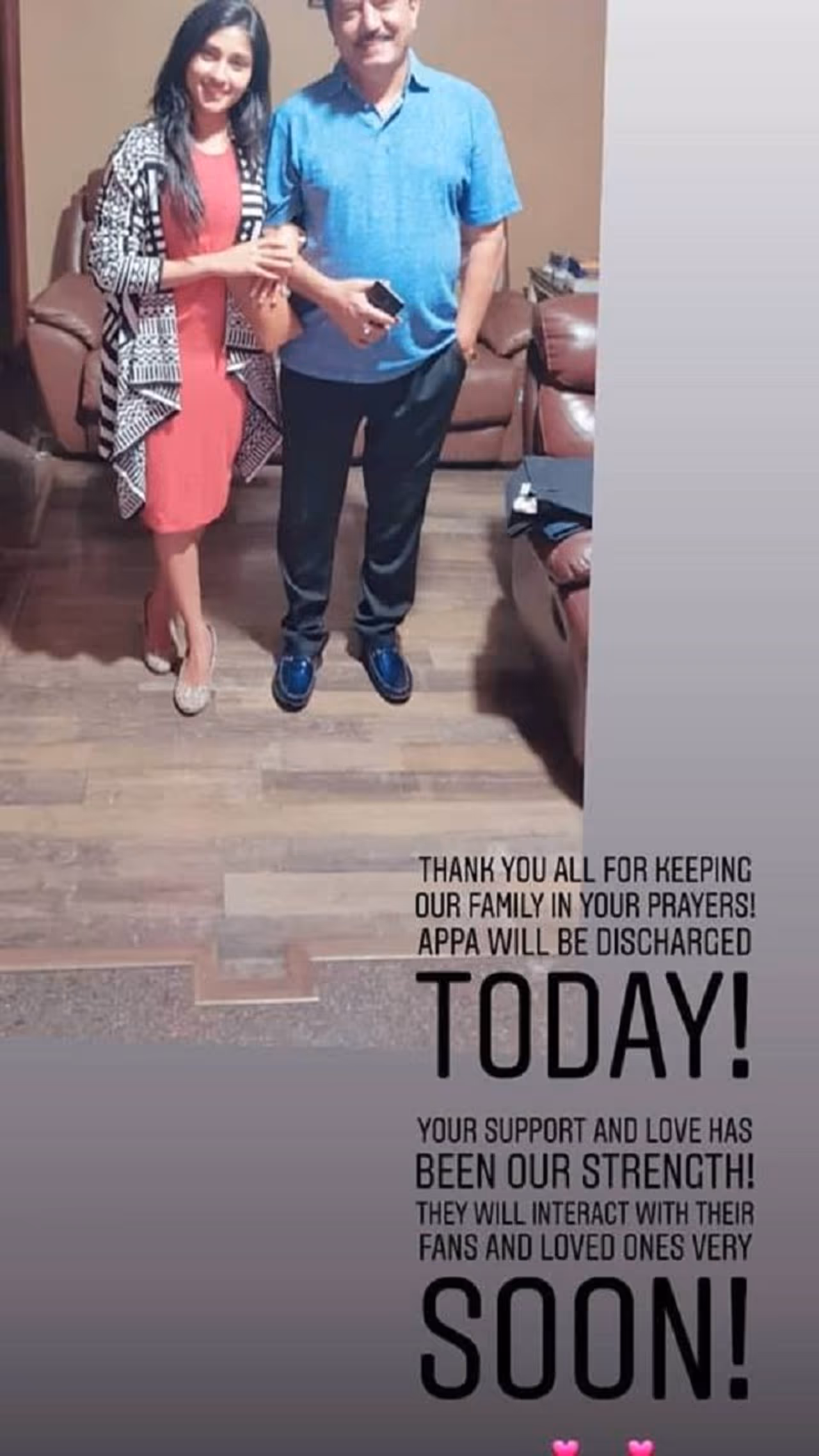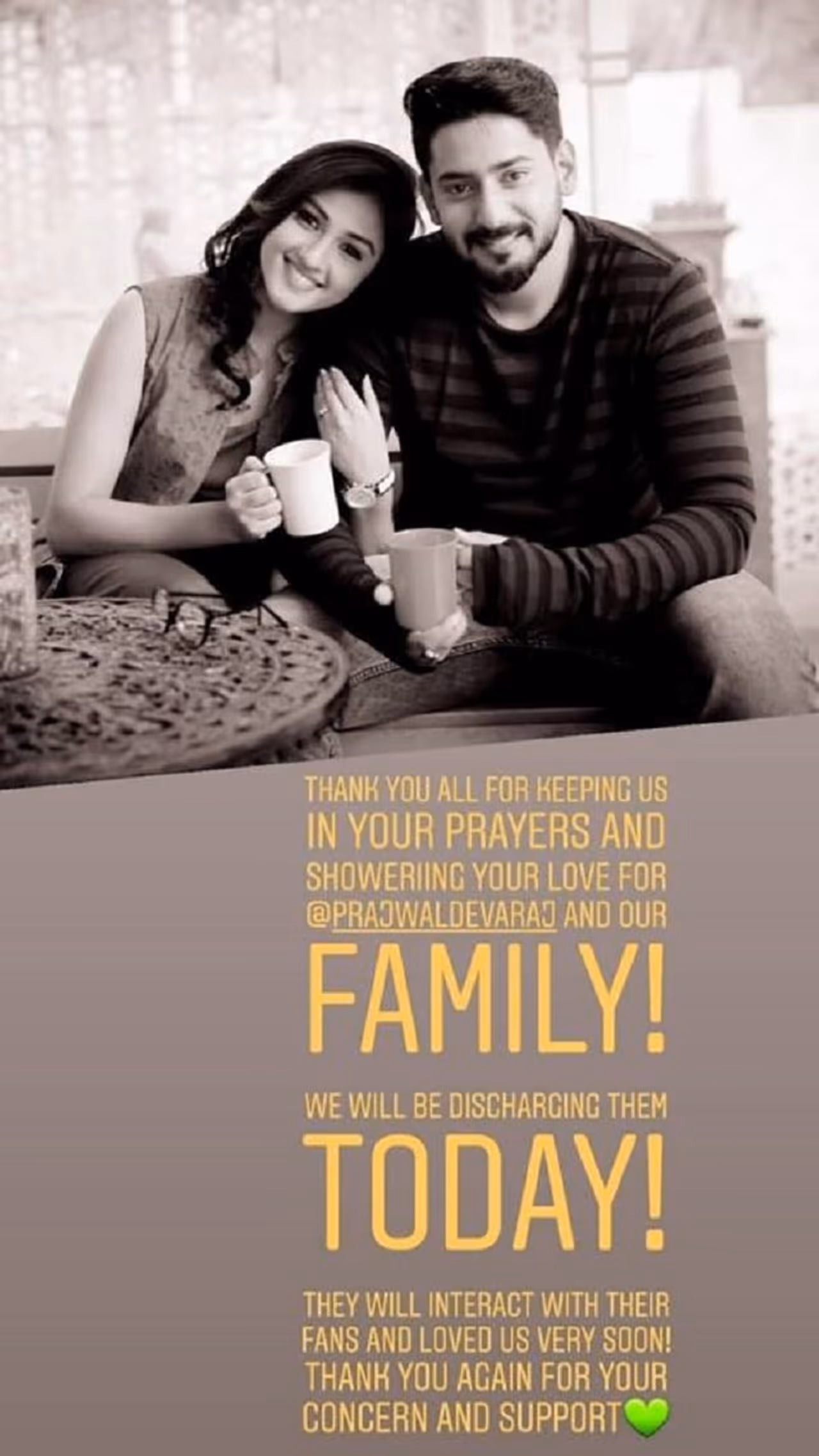 ನಟ ಪ್ರಜ್ವಲ್ ದೇವರಾಜ್ ಪತ್ನಿ ರಾಗಿಣಿ ದೇವರಾಜ್, ನಿಮ್ಮೆಲ್ಲರ ಪ್ರೀತಿ, ಹಾರೈಕೆಯೇ ನಮ್ಮ ಶಕ್ತಿ. ಅಪ್ಪಾ ಇಂದು ಡಿಸ್ಚಾರ್ಜ್ ಆಗುತ್ತಿದ್ದಾರೆ. ಎಲ್ಲಾ ಅಭಿಮಾನಿಗಳ ಜೊತೆ ಶೀಘ್ರದಲ್ಲೇ ಮಾತಿಗೆ ಸಿಗಲಿದ್ದಾರೆ ಎಂದು ಇನ್ಸ್ಟಾಗ್ರಾಮ್ ನಲ್ಲಿ ಬರೆದುಕೊಂಡಿದ್ದಾರೆ.