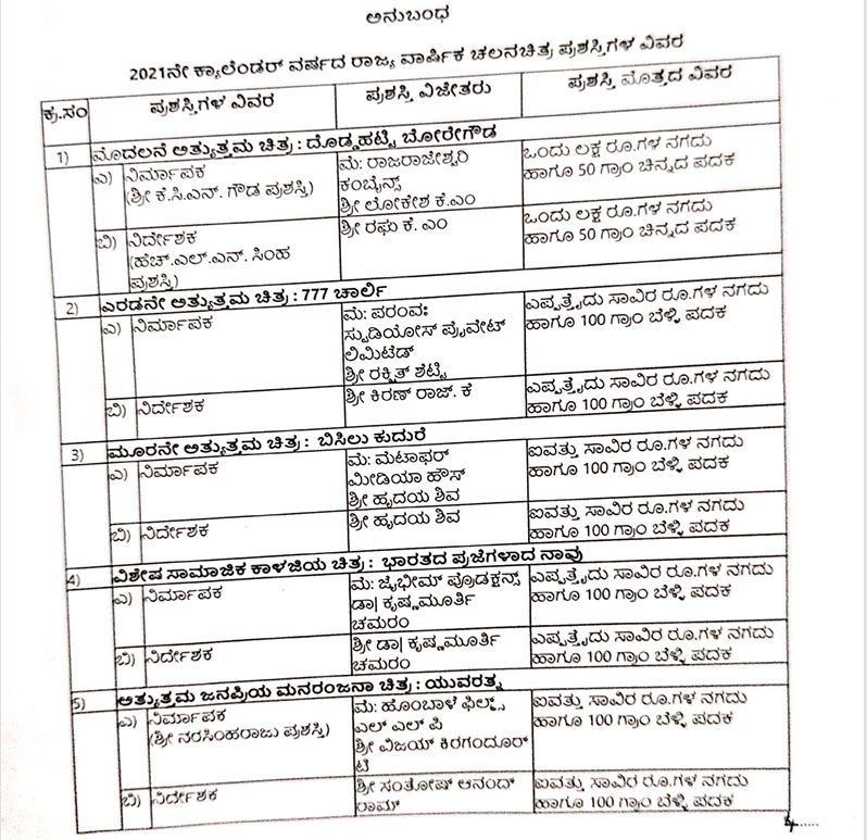 ಕರ್ನಾಟಕ ಸರ್ಕಾರ ಪ್ರತಿವರ್ಷ ಕನ್ನಡ ಸಿನಿಮಾಗಳಿಗಾಗಿ ಕೊಡುವ ರಾಜ್ಯ ಪ್ರಶಸ್ತಿಯಿದು. ಆದರೆ, ಈಗ ಬಂದಿರುವ ಈ ಪಟ್ಟಿ 2021ರ ರಾಜ್ಯ ಪ್ರಶಸ್ತಿಯದು ಎಂಬುದು ಗಮನಸಿಬೇಕಾದ ಸಂಗತಿ. ಈ ಸ್ಟೋರಿಯಲ್ಲಿ ಕೆಳಗೆ ರಾಜ್ಯ ಪ್ರಶಸ್ತಿ ವಿಜೇತರ ಸಂಪೂರ್ಣ ವಿವರ ಲಭ್ಯವಿರುವ ಪಟ್ಟಿ ಲಭ್ಯವಿದೆ, ನೋಡಿ ಆನಂದಿಸಿ..