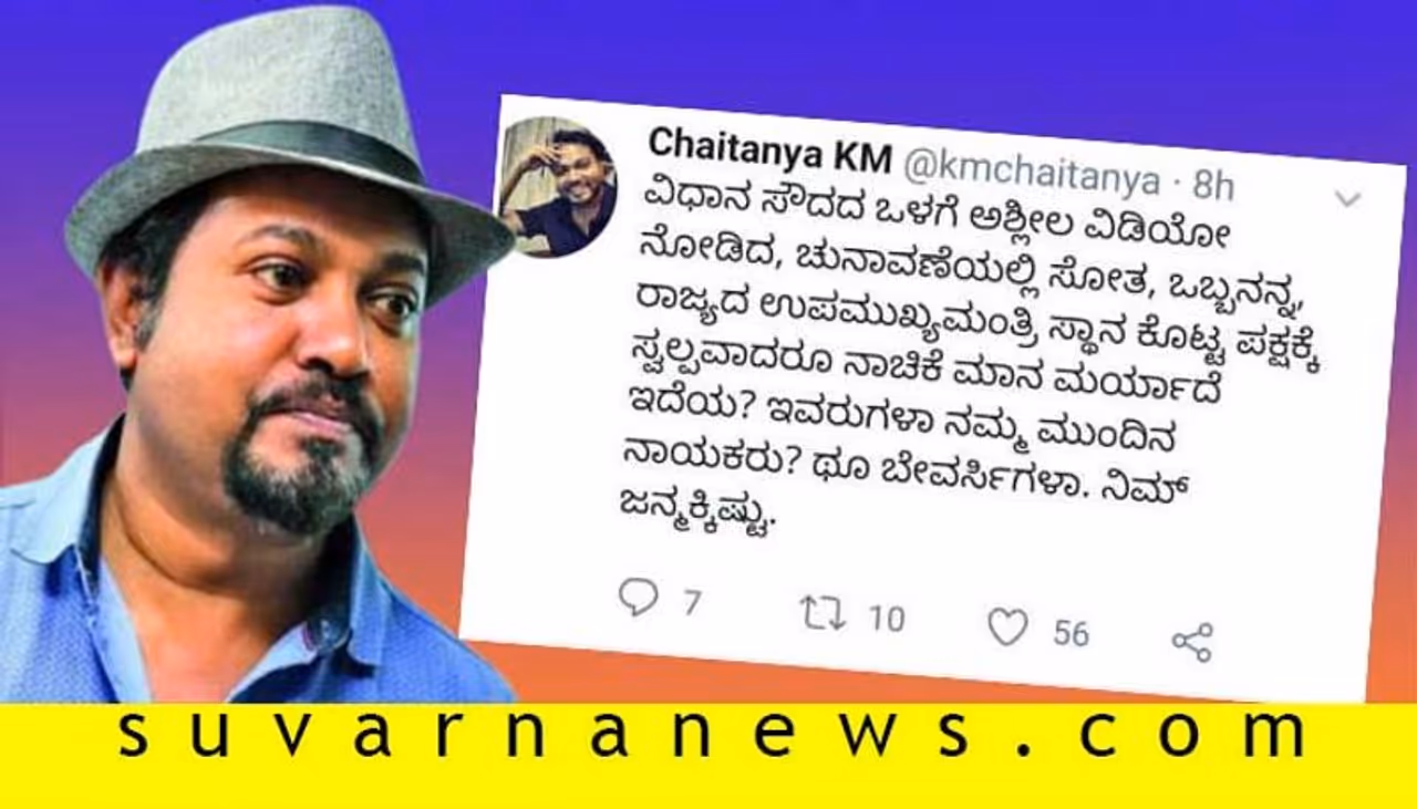 ಸದನದಲ್ಲಿ ಅಶ್ಲೀಲ ವಿಡಿಯೋ ನೋಡಿದ ವ್ಯಕ್ತಿಗೆ ಉಪಮುಖ್ಯಮಂತ್ರಿ ಸ್ಥಾನ ಕೊಟ್ಟಿದಕ್ಕೆ ನಿರ್ದೇಶಕ ಕೆ.ಎಂ. ಚೈತನ್ಯ ಟ್ಟೀಟ್ ಮೂಲಕ ಆಕ್ರೋಶ ವ್ಯಕ್ತಪಡಿಸಿದ್ದಾರೆ.