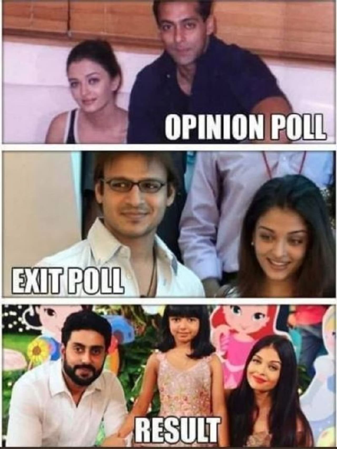 ಕ್ಸಿಟ್ ಪೋಲ್ ಬಗ್ಗೆ ಜನ ಎಕ್ಸೈಟ್ ಆಗಿದ್ದಾರೆ. ಸಿಕ್ಕಾಪಟ್ಟೆ ಚರ್ಚೆ ಶುರುವಾಗಿದೆ. ಕೆಲವರು ಪರ ಮಾತನಾಡಿದರೆ ಇನ್ನು ಕೆಲವರು ವಿರೋಧವಾಗಿ ಮಾತನಾಡುತ್ತಿದ್ದಾರೆ. ಒಂದಷ್ಟು ಟ್ರೋಲ್ ಗಳು ಆಗುತ್ತಿವೆ. ಎಕ್ಸಿಟ್ ಪೋಲ್ ಬಗ್ಗೆ ಐಶ್ವರ್ಯಾ ರೈ, ಸಲ್ಮಾನ್ ಖಾನ್ ಹಾಗೂ ವಿವೇಕ್ ಒಬೆರಾಯ್ ಇಟ್ಟುಕೊಂಡು ಟ್ರೋಲ್ ಮಾಡಿದ್ದಾರೆ.