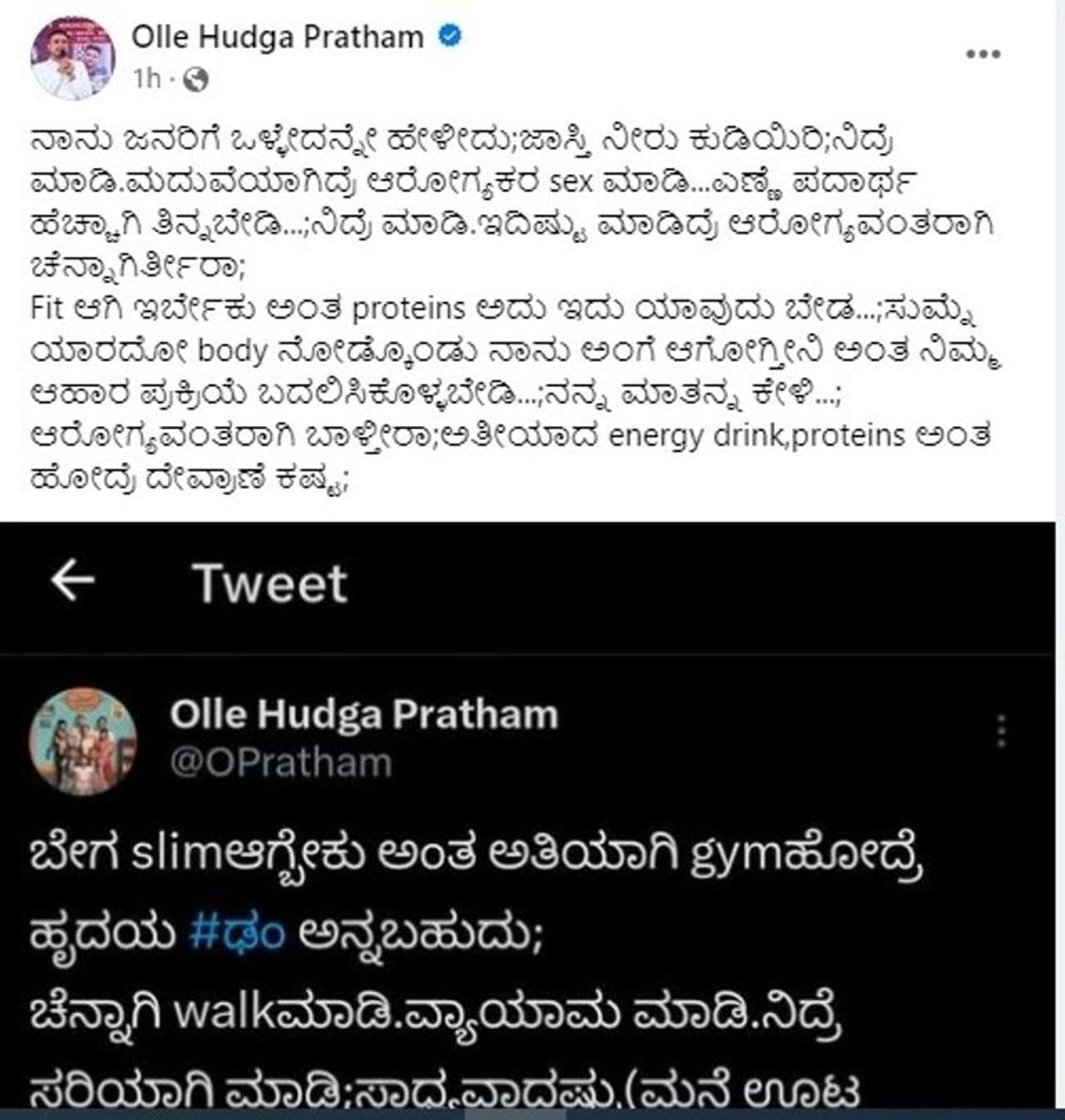 ಅದರ ಬೆನ್ನಲ್ಲಿಯೇ ಸಲಹೆ ಎನ್ನುವ ರೀತಿಯಲ್ಲಿ ಪ್ರಥಮ್ ಇನ್ನೊಂದು ಪೋಸ್ಟ್ ಮಾಡಿದ್ದಾರೆ. 'ಬೇಗ ಸ್ಲಿಮ್ ಆಗ್ಬೇಕು ಅಂತ ಅತಿಯಾಗಿ ಜಿಮ್ ಹೋದ್ರೆ ಹೃದಯ ಢಂ ಅನ್ನಬಹುದು. ಚೆನ್ನಾಗಿ ವಾಕ್ ಮಾಡಿ. ವ್ಯಾಯಾಮ ಮಾಡಿ. ನಿದ್ರೆ ಸರಿಯಾಗಿ ಮಾಡಿ. ಸಾಧ್ಯವಾದಷ್ಟು(ಮನೆ ಊಟ ಸೇವಿಸಿ 10 ಗಂಟೆ ನಿದ್ರೆ ಮಾಡಿ; ಮನಸಿನ ಆರೋಗ್ಯಕ್ಕೆ ಧ್ಯಾನ ಮಾಡಿ. ಸುಮ್ನೆ ಅತಿಯಾದ ಡಯಟ್ ಬೇಡ. ಇದ್ಯಾವುದು ಮಾಡದೇ ನಿಮ್ಮಪ್ಪ ತಾತ ಚೆನ್ನಾಗಿದ್ರು ಅನ್ನೋದ ಮರೀಬೇಡಿ. ಒಳ್ಳೇದನ್ನ ಕೇಳಿ' ಎಂದು ಫೇಸ್ಬುಕ್ನಲ್ಲಿ ಬರೆದುಕೊಂಡಿದ್ದಾರೆ. ಅದರ ಬೆನ್ನಲ್ಲಿಯೇ ಮತ್ತೊಂದು ಪೋಸ್ಟ್ ಹಂಚಿಕೊಂಡಿರುವ ಅವರು, 'ನಾನು ಜನರಿಗೆ ಒಳ್ಳೇದನ್ನೇ ಹೇಳೋದು. ಜಾಸ್ತಿ ನೀರು ಕುಡಿಯಿರಿ. ನಿದ್ರೆ ಮಾಡಿ. ಮದುವೆಯಾಗಿದ್ರೆ ಆರೋಗ್ಯಕರ ಸೆಕ್ಸ್ ಮಾಡಿ. ಎಣ್ಣೆ ಪದಾರ್ಥ ಹೆಚ್ಚಾಗಿ ತಿನ್ನಬೇಡಿ. ನಿದ್ರೆ ಮಾಡಿ. ಇದಿಷ್ಟು ಮಾಡಿದ್ರೆ ಆರೋಗ್ಯವಂತರಾಗಿ ಚೆನ್ನಾಗಿರ್ತೀರಾ. ಫಿಟ್ ಆಗಿ ಇರ್ಬೇಕು ಅಂತ ಪ್ರೋಟೀನ್ಸ್ ಅದು ಇದು ಯಾವುದು ಬೇಡ...ಸುಮ್ನೆ ಯಾರದೋ ಬಾಡಿ ನೋಡ್ಕೊಂಡು ನಾನು ಅಂಗೆ ಆಗೋಗ್ತೀನಿ ಅಂತ ನಿಮ್ಮ ಆಹಾರ ಪ್ರಕ್ರಿಯೆ ಬದಲಿಸಿಕೊಳ್ಳಬೇಡಿ...ನನ್ನ ಮಾತನ್ನ ಕೇಳಿ...; ಆರೋಗ್ಯವಂತರಾಗಿ ಬಾಳ್ತೀರಾ.. ಅತೀಯಾದ ಎನರ್ಜಿ ಡ್ರಿಂಕ್, ಪ್ರೋಟೀನ್ಸ್ ಅಂತ ಹೋದ್ರೆ ದೇವ್ರಾಣೆ ಕಷ್ಟ' ಎಂದು ಬರೆದುಕೊಂಡಿದ್ದಾರೆ.