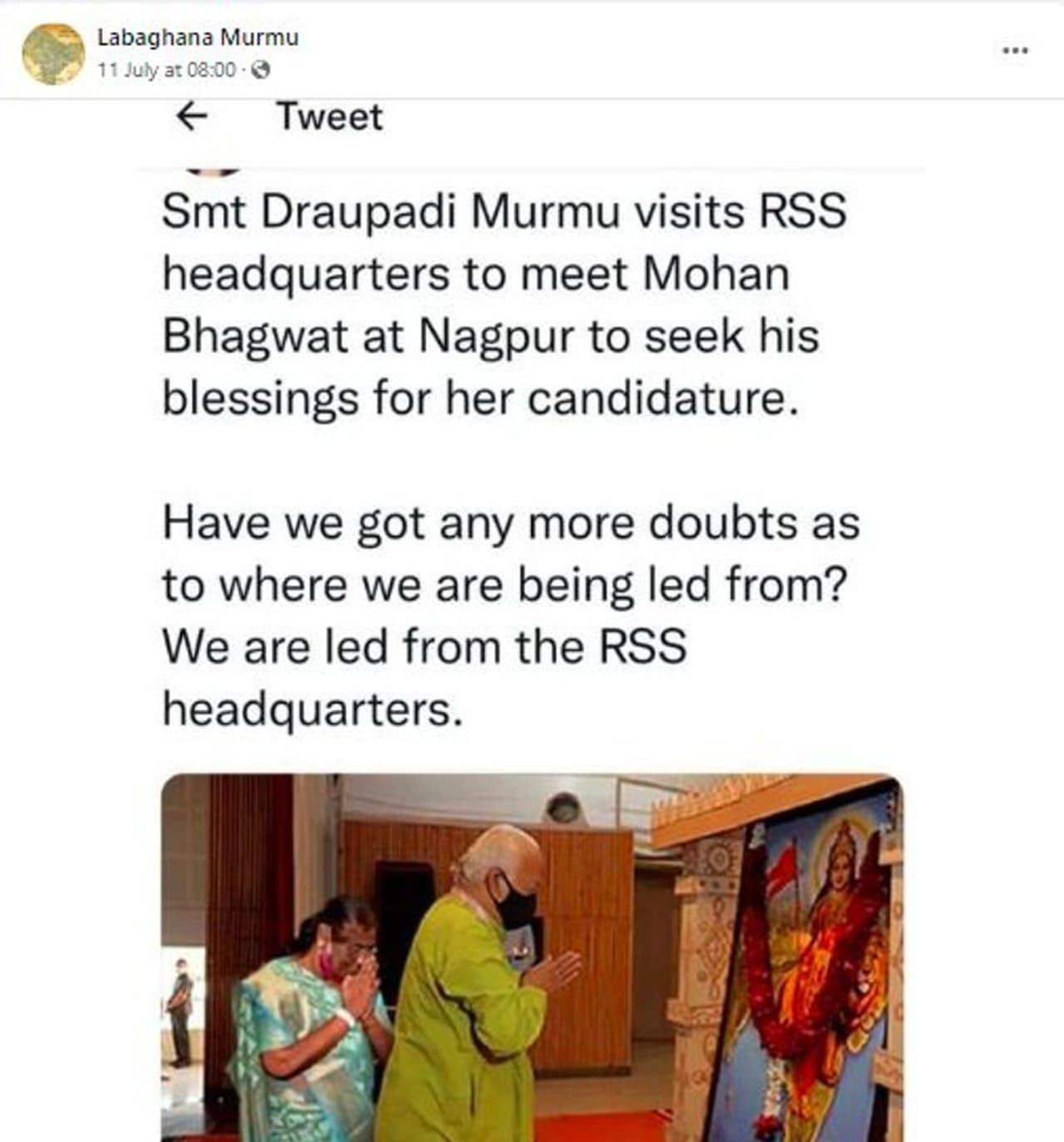 ಅನುವಾದ: ಶ್ರೀಮತಿ ದ್ರೌಪದಿ ಮುರ್ಮು ಅವರು ತಮ್ಮ ಉಮೇದುವಾರಿಕೆಗೆ ಆಶೀರ್ವಾದ ಪಡೆಯಲು ಮೋಹನ್ ಭಾಗವತ್ ಅವರನ್ನು ಭೇಟಿ ಮಾಡಲು ನಾಗಪುರದ ಆರ್ಎಸ್ಎಸ್ ಪ್ರಧಾನ ಕಛೇರಿಗೆ ಭೇಟಿ ನೀಡಿದರು. ನಮ್ಮನ್ನು ಎಲ್ಲಿಗೆ ಕೊಂಡೊಯ್ಯಲಾಗುತ್ತಿದೆ ಎಂಬ ಬಗ್ಗೆ ನಮಗೆ ಇನ್ನೂ ಅನುಮಾನವಿದೆಯೇ? ನಾವು ಆರ್ಎಸ್ಎಸ್ ಕೇಂದ್ರ ಕಚೇರಿಯಿಂದ ಮುನ್ನಡೆಸಲ್ಪಡುತ್ತಿದ್ದೇವೆ. ಹಲವು ಫೇಸ್ಬುಕ್ ಬಳಕೆದಾರರು ಇದೇ ಮಾಹಿತಿಯೊಂದಿಗೆ ಈ ಚಿತ್ರವನ್ನು ಹಂಚಿಕೊಳ್ಳುತ್ತಿದ್ದಾರೆ.
