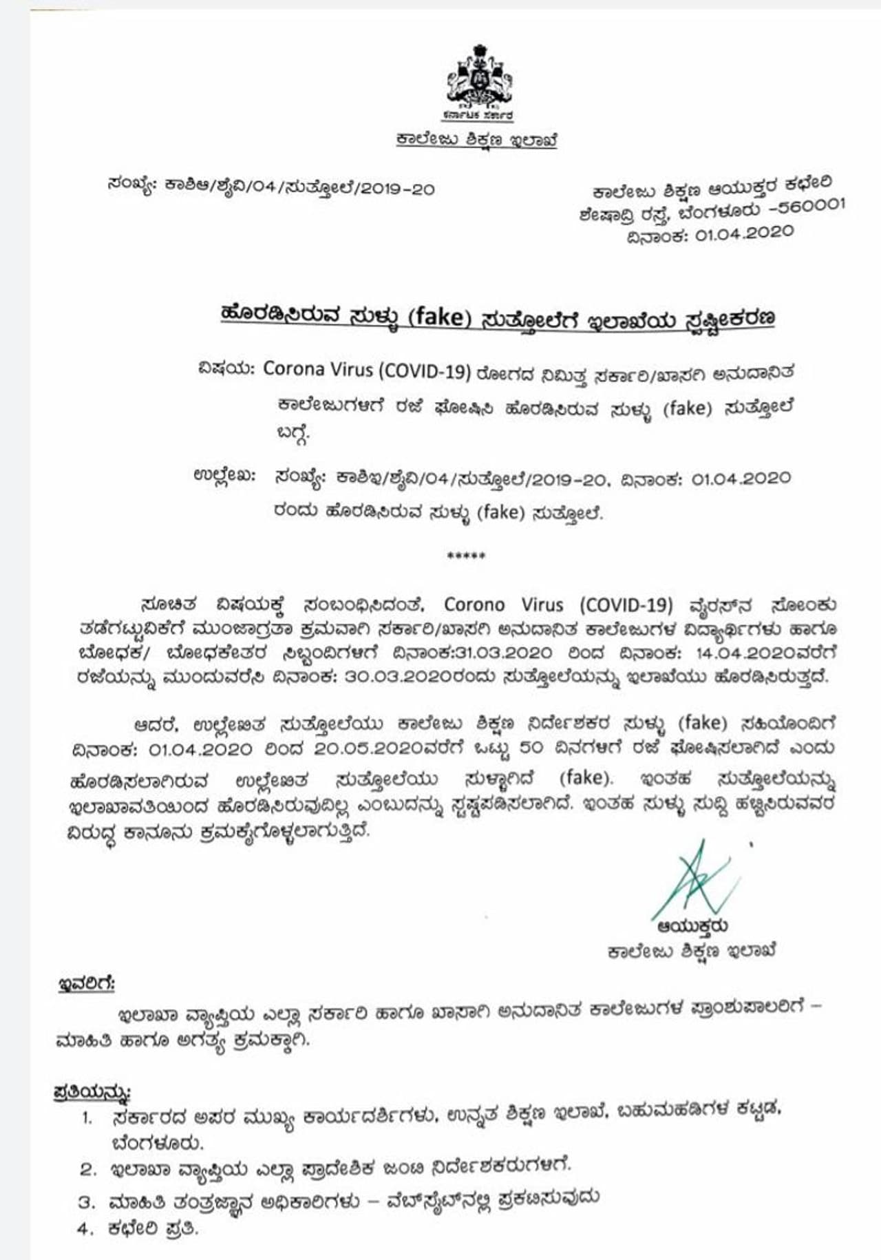 ಆದ್ರೆ, ಮೇ 20ರ ವರೆಗೆ ಅಂದ್ರೆ 50 ದಿನ ರಜೆ ನೀಡಿದೆ ಎನ್ನುವ ಸುತ್ತೋಲೆ ಸುಳ್ಳಾಗಿರುತ್ತದೆ ಎಂದು ಕಾಲೇಜು ಶಿಕ್ಷಣ ಆಯುಕ್ತರು ಪ್ರಕಟಣೆಯಲ್ಲಿ ತಿಳಿಸಿದ್ದಾರೆ.
