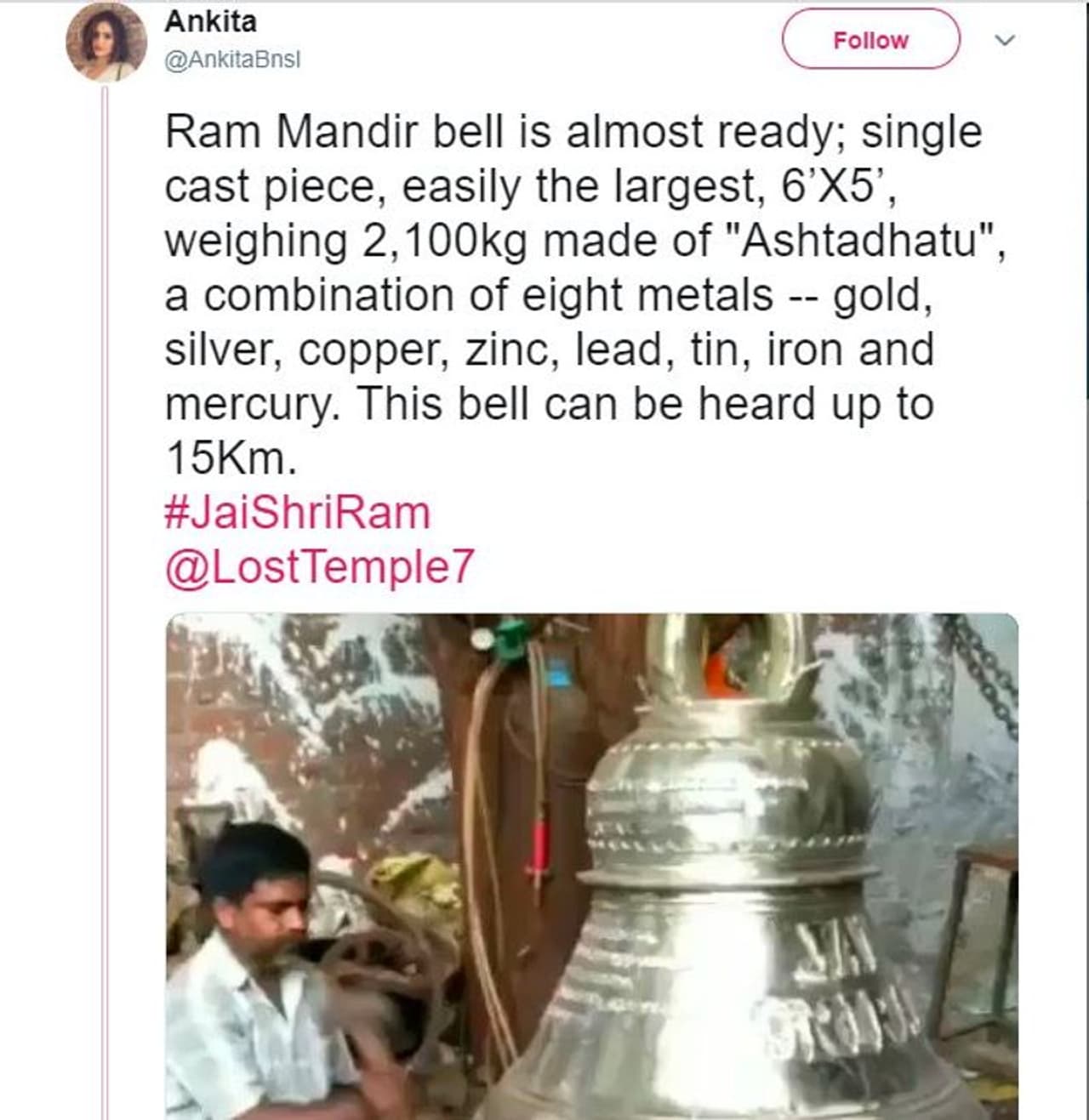 ಆದರೆ, ವಾಸ್ತವ ಸಂಗತಿಯೇನೆಂದರೆ ಉತ್ತರ ಪ್ರದೇಶದ ಶಿಲ್ಪಿ ಇಕ್ಬಾಲ್ ಮಿಸ್ತಿ್ರ ಎನ್ನುವವರು ಅಯೋಧ್ಯೆಯಲ್ಲಿ ರಾಮಮಂದಿರಕ್ಕಾಗಿ ಬೃಹತ್ ಗಂಟೆಯೊಂದನ್ನು ನಿರ್ಮಿಸಿಕೊಡುವ ಕೆಲಸದಲ್ಲಿ ತೊಡಗಿಕೊಂಡಿದ್ದಾರೆ. ಅದರ ಚಿತ್ರಗಳು ಅಧಿಕೃತವಾಗಿ ಬಿಡುಗಡೆ ಆಗಿಲ್ಲ. ವೈರಲ್ ಆಗಿರುವ ಗಂಟೆಯನ್ನು ತಮಿಳುನಾಡಿನಲ್ಲಿ ಸಿದ್ಧಪಡಿಸಲಾಗಿದ್ದು, 600 ಕೆ.ಜಿ. ತೂಕ ಇದೆ. ಅದರ ಮೇಲೆ ತಮಿಳು ಅಕ್ಷರಗಳಿವೆ. ಹೀಗಾಗಿ ಅಯೋಧ್ಯೆಯಲ್ಲಿ ಬಳಕೆ ಆಗಲಿರುವ ಪ್ರಧಾನ ಗಂಟೆ ಇದಲ್ಲ.