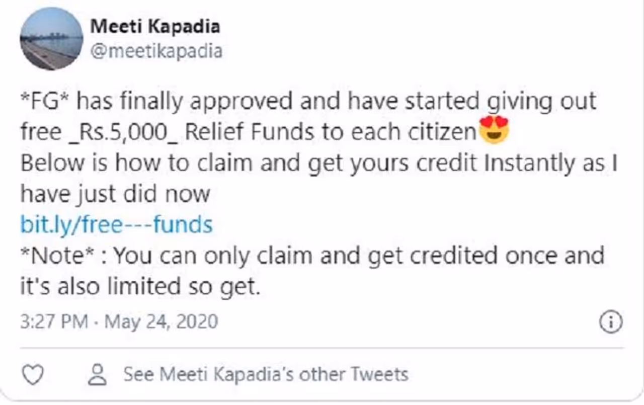 ಸಂದೇಶದ ಜೊತೆಗೆ ಲಿಂಕ್ವೊಂದನ್ನು ಲಗತ್ತಿಸಿ, ‘ಕೊನೆಗೂ ಕೇಂದ್ರ ಸರ್ಕಾರ ದೇಶದ ಪ್ರತಿ ಪ್ರಜೆಗೂ 5000 ರು. ಲಾಕ್ಡೌನ್ ಪರಿಹಾರ ಧನ ನೀಡುತ್ತಿದೆ. ಕೆಳಗಿನ ಲಿಂಕ್ ಮೇಲೆ ಕ್ಲಿಕ್ ಮಾಡಿ ಹಣ ಪಡೆದುಕೊಳ್ಳಿ. ವಿ.ಸೂ: ಒಬ್ಬರು ಒಮ್ಮೆ ಮಾತ್ರ ಹಣ ಪಡೆಯಬಹುದು. ಹಾಗೆಯೇ ಕೆಲವೇ ಕೆಲವರು ಮಾತ್ರ ಈ ಸೌಲಭ್ಯ ಪಡೆಯಬಹುದು’ ಎಂದು ಹೇಳಲಾಗಿದೆ. ಈ ಸಂದೇಶ ಫೇಸ್ಬುಕ್, ಟ್ವೀಟರ್ನಲ್ಲಿ ವೈರಲ್ ಆಗುತ್ತಿದೆ.