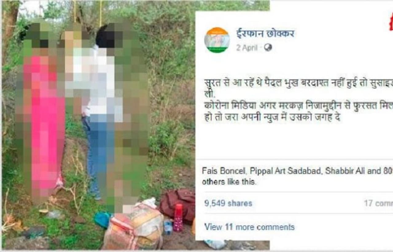 ದಂಪತಿ ಮತ್ತು ಮಗು ಮರಕ್ಕೆ ನೇಣು ಬಿಗಿದುಕೊಂಡು ಆತ್ಮಹತ್ಯೆ ಮಾಡಿಕೊಂಡಿರುವ ಫೋಟೋವನ್ನು ಪೋಸ್ಟ್ ಮಾಡಿ, ದೇಶವ್ಯಾಪಿ ಕೊರೋನಾ ಲಾಕ್ಡೌನ್ ಪರಿಣಾಮ ತಿನ್ನಲು ಅನ್ನವೂ ಇಲ್ಲದೆ ಇವರು ಆತ್ಮಹತ್ಯೆಗೆ ಶರಣಾಗಿದ್ದಾರೆ ಎಂದಿರುವ ಸಂದೇಶ ಸಾಮಾಜಿಕ ಜಾಲತಾಣಗಳಲ್ಲಿ ವೈರಲ್ ಆಗುತ್ತಿದೆ. ನಿಜನಾ ಇದು?
