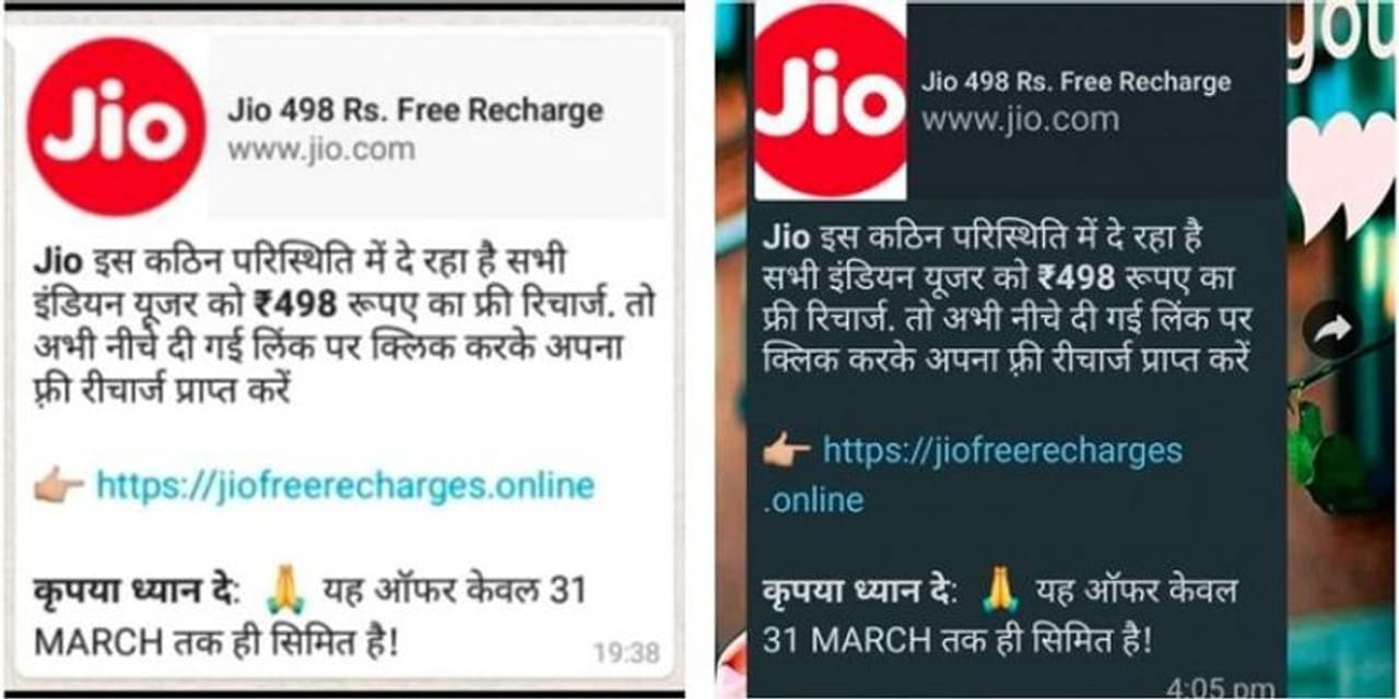 ವೈರಲ್ ಆಗಿರುವ ಸಂದೇಶ ಹಿಂದಿ ಭಾಷೆಯಲ್ಲಿದ್ದು, ‘ಇಂಥ ಸಂದಿಗ್ಧ ಸನ್ನಿವೇಶದಲ್ಲಿ ಜಿಯೋ ತನ್ನ ಬಳಕೆದಾರರಿಗೆ 498 ರು. ಉಚಿತ ರೀಚಾರ್ಜ್ ಆಫರ್ ನೀಡಿದೆ. ಇದನ್ನು ಸದುಪಯೋಗಪಡಿಸಿಕೊಳ್ಳಲು ಕೆಳಕಂಡ ಲಿಂಕ್ ಮೇಲೆ ಕ್ಲಿಕ್ ಮಾಡಿ. ವಿಶೇಷ ಸೂಚನೆ: ಈ ಆಫರ್ ಮಾಚ್ರ್ 31ರ ವರೆಗೆ ಮಾತ್ರ ಲಭ್ಯವಿರುತ್ತದೆ’ ಎಂದು ಹೇಳಲಾಗಿದೆ.