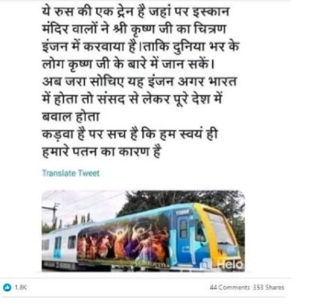 ನೆಟ್ಟಿಗರು ಇದನ್ನು ಶೇರ್ ಮಾಡಿ, ‘ಶ್ರೀ ಕೃಷ್ಣ ಪರಮಾತ್ಮನ ಬಗ್ಗೆ ಜಗತ್ತಿಗೇ ಸಾರುವ ಉದ್ದೇಶದಿಂದ ಇಸ್ಕಾನ್ ದೇಗುಲದ ಜನರು ರಷ್ಯಾದಲ್ಲಿ ರೈಲಿನ ಮೇಲೆ ಕೃಷ್ಣನ ಫೋಟೋವನ್ನು ಅಂಟಿಸಿದ್ದಾರೆ. ಯೋಚಿಸಿ, ಈ ರೈಲು ಭಾರತದ್ದಾಗಿದ್ದರೆ ಸಂಸತ್ ಮತ್ತು ದೇಶಾದ್ಯಂತ ಗದ್ದಲಗಳೇ ಆರಂಭವಾಗುತ್ತಿದ್ದವು. ಕಹಿ ಸತ್ಯ ಎಂದರೆ ನಮ್ಮ ಅವನತಿಗೆ ನಾವೇ ಕಾರಣ’ ಎಂದು ಬರೆದುಕೊಂಡಿದ್ದಾರೆ.