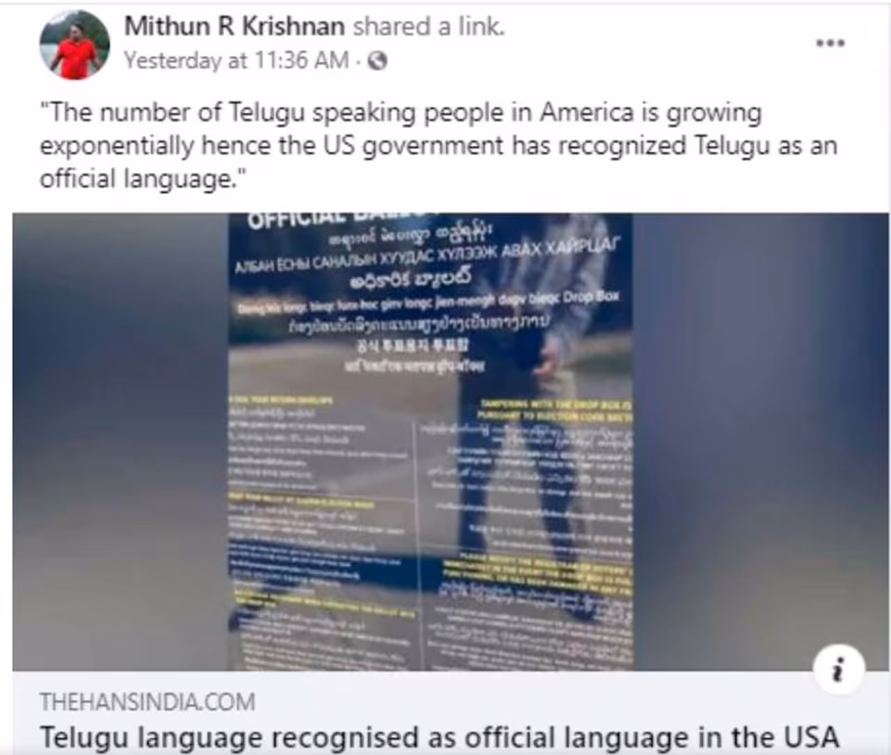 ದಿ ಹನ್ಸ್ ಇಂಡಿಯಾ’ ಸುದ್ದಿಸಂಸ್ಥೆ ‘ಅಮೆರಿಕ ತೆಲುಗು ಭಾಷೆಯನ್ನು ಅಧಿಕೃತ ಭಾಷೆಯೆಂದು ಪರಿಗಣಿಸಿ ಬ್ಯಾಲಟ್ ಬಾಕ್ಸ್ನಲ್ಲಿ ಸ್ಥಳ ನೀಡಿದೆ’ ಎಂಬ ಶೀರ್ಷಿಕೆಯಡಿ ಸುದ್ದಿಯನ್ನು ಪ್ರಕಟಿಸಿದೆ. ಇದನ್ನು ಫೇಸ್ಬುಕ್ ಸೇರಿದಂತೆ ವಿವಿಧ ಜಾಲತಾಣಗಳಲ್ಲಿ ನೆಟ್ಟಿಗರು ಶೇರ್ ಮಾಡುತ್ತಿದ್ದಾರೆ. ಅಮೆರಿಕದಲ್ಲಿ ತೆಲುಗು ಭಾಷಿಕರ ಸಂಖ್ಯೆ ಹೆಚ್ಚಾಗುತ್ತಿರುವ ಹಿನ್ನೆಲೆಯಲ್ಲಿ ಅಮೆರಿಕ ದಕ್ಷಿಣ ಭಾರತದ ಪ್ರಮುಖ ಭಾಷೆಗಳಲ್ಲಿ ಒಂದಾದ ತೆಲುಗನ್ನು ಅಧಿಕೃತ ಭಾಷೆ ಎಂದು ಪರಿಗಣಿಸಿದೆ’ ಎಂದು ಕೆಲವರು ಒಕ್ಕಣೆ ಬರೆದುಕೊಂಡಿದ್ದಾರೆ.