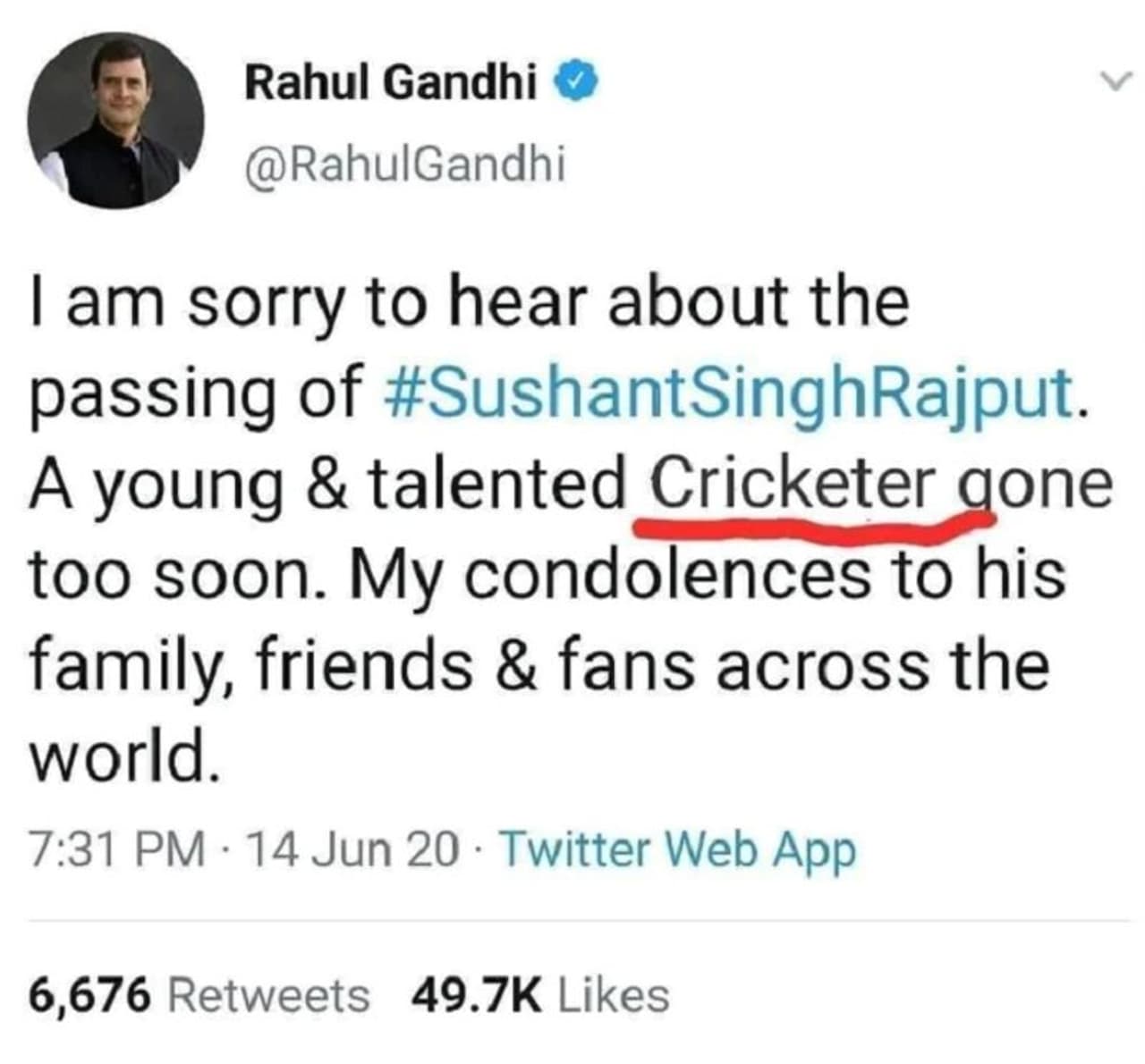 ರಾಹುಲ್ ಗಾಂಧಿ ಸುಶಾಂತ್ ಅವರನ್ನು ಯಂಗ್ & ಟ್ಯಾಲೆಂಟೆಡ್ ಕ್ರಿಕೆಟರ್ ಎಂದು ಸಂಬೋಧಿಸಿದ ಟ್ವೀಟ್ ಫೋಟೋ ಸೋಷಿಯಲ್ ಮೀಡಿಯಾದಲ್ಲಿ ವೈರಲ್ ಆಗಿತ್ತು. ಆದರೆ ಇದೊಂದು ಸುಳ್ಳು ಟ್ವೀಟ್ ಎಂಬುದು ನಂತರದಲ್ಲಿ ಬಯಲಾಗಿದೆ. ಬೇಕೆಂದೇ ರಾಹುಲ್ ಗಾಂಧಿ ಟ್ವೀಟರ್ ಖಾತೆ ಮಾರ್ಫಿಂಗ್ ಮಾಡಿ ಈ ರೀತಿ ಮಾಡಲಾಗಿದೆ ಎಂಬುದು ಸಾಬೀತಾಗಿದೆ.