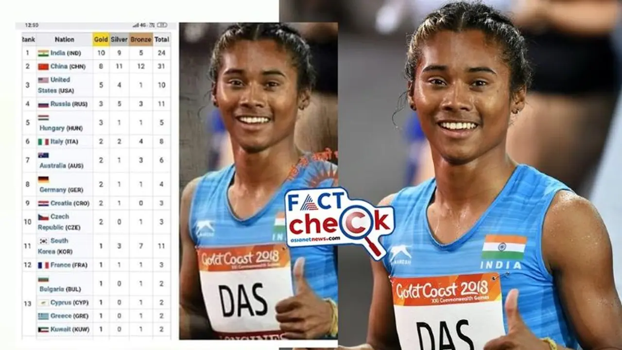 ಪೋಸ್ಟ್ನಲ್ಲಿ ಪಾಯಿಂಟ್ಗಳ ಪಟ್ಟಿಯ ಚಿತ್ರವನ್ನು ಹಂಚಿಕೊಂಳ್ಳಲಾಗಿದ್ದು ಹಿಮಾ ದಾಸ್ ಕಾಮನ್ವೆಲ್ತ್ ಗೇಮ್ಸ್ನಲ್ಲಿ ಹತ್ತರಲ್ಲಿ ಆರು ಚಿನ್ನ ಗೆದ್ದಿದ್ದಾರೆ ಎಂದು ಹೇಳಲಾಗಿದೆ. ಈ ಬಳಿಕ ಭಾರತ ಅಂಕಪಟ್ಟಿಯಲ್ಲಿ ಅಗ್ರಸ್ಥಾನಕ್ಕೇರಿತು ಎಂದು ಹೇಳಲಾಗಿದೆ. ಏಷ್ಯಾನೆಟ್ ಸುವರ್ಣ ನ್ಯೂಸ್ ತನಿಖೆಯಲ್ಲಿ ಈ ಹೇಳಿಕೆ ಸುಳ್ಳು ಎಂದು ತಿಳಿದುಬಂದಿದೆ. ಹಿಮಾ ದಾಸ್ ಕಾಮನ್ವೆಲ್ತ್ ಗೇಮ್ಸ್ನಲ್ಲಿ ಯಾವುದೇ ಪದಕ ಗೆದ್ದಿರಲಿಲ್ಲ.