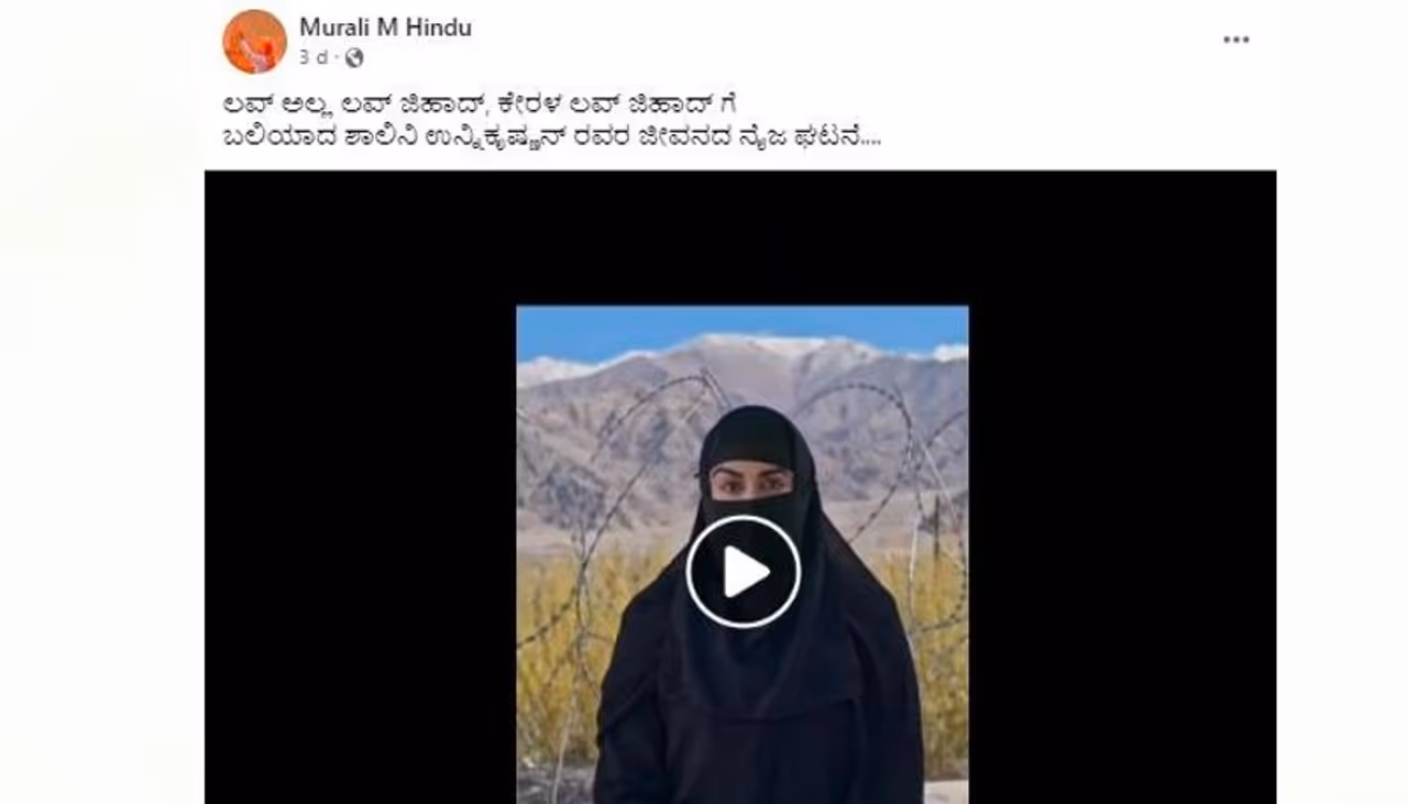 ನವದೆಹಲಿ (ನ. 07): ಕೇರಳದಲ್ಲಿ ಹಿಂದೂ ಸಮುದಾಯಕ್ಕೆ ಸೇರಿದ ಮಹಿಳೆಯೊಬ್ಬರು ಇಸ್ಲಾಂ ಧರ್ಮಕ್ಕೆ ಮತಾಂತರವಾಗಿ ಐಸಿಸ್ಗೆ ಸೇರ್ಪಡೆಯಾಗಿದ್ದಾರೆ ಎಂಬ ಶೀರ್ಷಿಕೆಯೊಂದಿಗೆ ವಿಡಿಯೋವೊಂದು ಸಾಮಾಜಿಕ ಜಾಲತಾಣಗಳಲ್ಲಿ(Social Media) ವೈರಲ್ ಆಗಿದೆ. ಕೆಲವು ಸೆಕೆಂಡ್ಗಳ ಕಾಲ ಇರುವ ಈ ವಿಡಿಯೋದಲ್ಲಿರುವ ಮಹಿಳೆ ತನ್ನ ಹೆಸರನ್ನು ಶಾಲಿನಿ ಉನ್ನಿಕೃಷ್ಣನ್ ಎಂದು ಹೇಳಿಕೊಂಡಿದ್ದಾರೆ. ಈ ವಿಡಿಯೋವನ್ನು ಹಂಚಿಕೊಂಡಿರುವ ಹಲವರು, ಹಿಂದೂ ಧರ್ಮವನ್ನು ತೊರೆದು ಹೋದ ಕಾರಣದಿಂದ ಈ ರೀತಿಯಾಗಿದ್ದು ಸರಿಯಾಗಿದೆ ಎಂದು ಹೇಳಿದ್ದಾರೆ. ಇನ್ನೂ ಕೆಲವರು ಕೇರಳ ಮಹಿಳೆಯರನ್ನು ಅಪಹರಿಸಿ ಐಸಿಸ್ಗೆ (ISIS) ಸೇರ್ಪಡೆ ಮಾಡಲಾಗುತ್ತಿದೆ ಎಂದು ಹೇಳಿದ್ದಾರೆ.