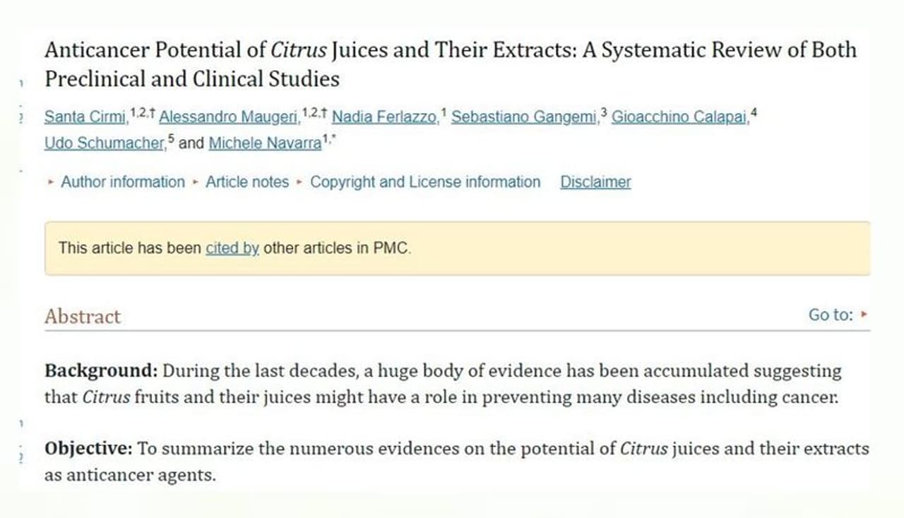 ಶೀರ್ಷಿಕೆಯೊಂದಿಗೆ ಈ ಲಿಂಕ್ನಲ್ಲಿ ಅಧ್ಯಯನವನ್ನು ವಿವರಿಸಲಾಗಿದೆ: ಸಿಟ್ರಸ್ ರಸಗಳು ಮತ್ತು ಅವುಗಳ ಸಾರಗಳ ಕ್ಯಾನ್ಸರ್ ವಿರೋಧಿ ಸಂಭಾವ್ಯತೆ: ಪೂರ್ವಭಾವಿ ಮತ್ತು ಕ್ಲಿನಿಕಲ್ ಅಧ್ಯಯನಗಳ ವ್ಯವಸ್ಥಿತ ವಿಮರ್ಶೆ