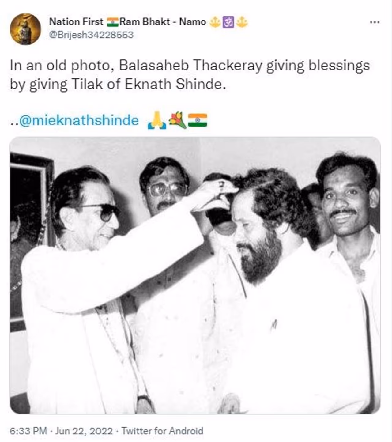 ಇತ್ತ ಉದ್ಧವ್ ಠಾಕ್ರೆ ಮುಖ್ಯಮಂತ್ರಿ ಸ್ಥಾನಕ್ಕೆ ರಾಜೀನಾಮೆ ನೀಡಿದ ಬೆನ್ನಲ್ಲೇ ಮಹಾರಾಷ್ಟ್ರದಲ್ಲಿ ರಾಜಕೀಯ ಬಿಕ್ಕಟ್ಟಿಗೆ ಕಾರಣವಾದ ಬಂಡಾಯ ನಾಯಕ ಏಕನಾಥ ಶಿಂಧೆಗೆ ಸ್ವತಃ ಬಾಳಾ ಠಾಕ್ರೆಯವರೇ ತಿಲಕವನ್ನು ಹಚ್ಚಿ ಅಭಿನಂದಿಸಿದ್ದರು ಎನ್ನಲಾದ ಹಳೆಯ ಫೋಟೊವೊಂದು ಸಾಮಾಜಿಕ ಜಾಲತಾಣದಲ್ಲಿ ವೈರಲ್ ಆಗಿದೆ. ಕಪ್ಪು ಬಿಳುಪಿನ ಈ ಹಳೆಯ ಫೋಟೊದಲ್ಲಿ ಬಾಳಾ ಠಾಕ್ರೆಯವರು ವ್ಯಕ್ತಿಯೊಬ್ಬನಿಗೆ ತಿಲಕ ಹಚ್ಚುತ್ತಿದ್ದಾರೆ. ಸ್ವತಃ ಬಾಳಾ ಸಾಹೇಬ್ ಏಕನಾಥ ಶಿಂಧೆಗೆ ತಿಲಕ ಹಚ್ಚಿ ಆಶೀರ್ವದಿಸಿದ್ದಾರೆ ಎಂದು ವೈರಲ್ ಆದ ಪೋಸ್ಟ್ನಲ್ಲಿ ಬರೆಯಲಾಗಿದೆ.