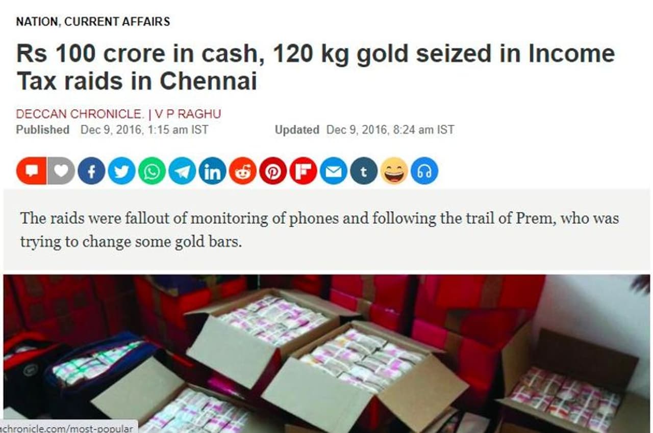 ಡಿಸೆಂಬರ್ 2016 ರಲ್ಲಿ ಪ್ರಕಟವಾದ ವರದಿಗಳಗನ್ನು ಗಮನಿಸಿದಾಗ, ಅದು ರೆಡ್ಡಿಗೆ ಸೇರಿದ ಆಸ್ತಿಯ ಮೇಲೆ ನಡೆಸಿದ ದಾಳಿಯ ಬಗ್ಗೆ ಹೇಳುತ್ತದೆ. 9 ಡಿಸೆಂಬರ್ 2016 ರಂದು ಡೆಕ್ಕನ್ ಕ್ರಾನಿಕಲ್ನಲ್ಲಿ ಪ್ರಕಟವಾದ ವರದಿಯು, "ಚೆನ್ನೈನಲ್ಲಿ ಆದಾಯ ತೆರಿಗೆ ದಾಳಿಯಲ್ಲಿ 100 ಕೋಟಿ ರೂಪಾಯಿ ನಗದು, 120 ಕೆಜಿ ಚಿನ್ನ ವಶಪಡಿಸಿಕೊಂಡಿದೆ" ಎಂದು ಖಚಿತಪಡಿಸುತ್ತದೆ. ಈ ವರದಿಯನ್ನು ನೀವು ಇಲ್ಲಿ ಓದಬಹುದು.