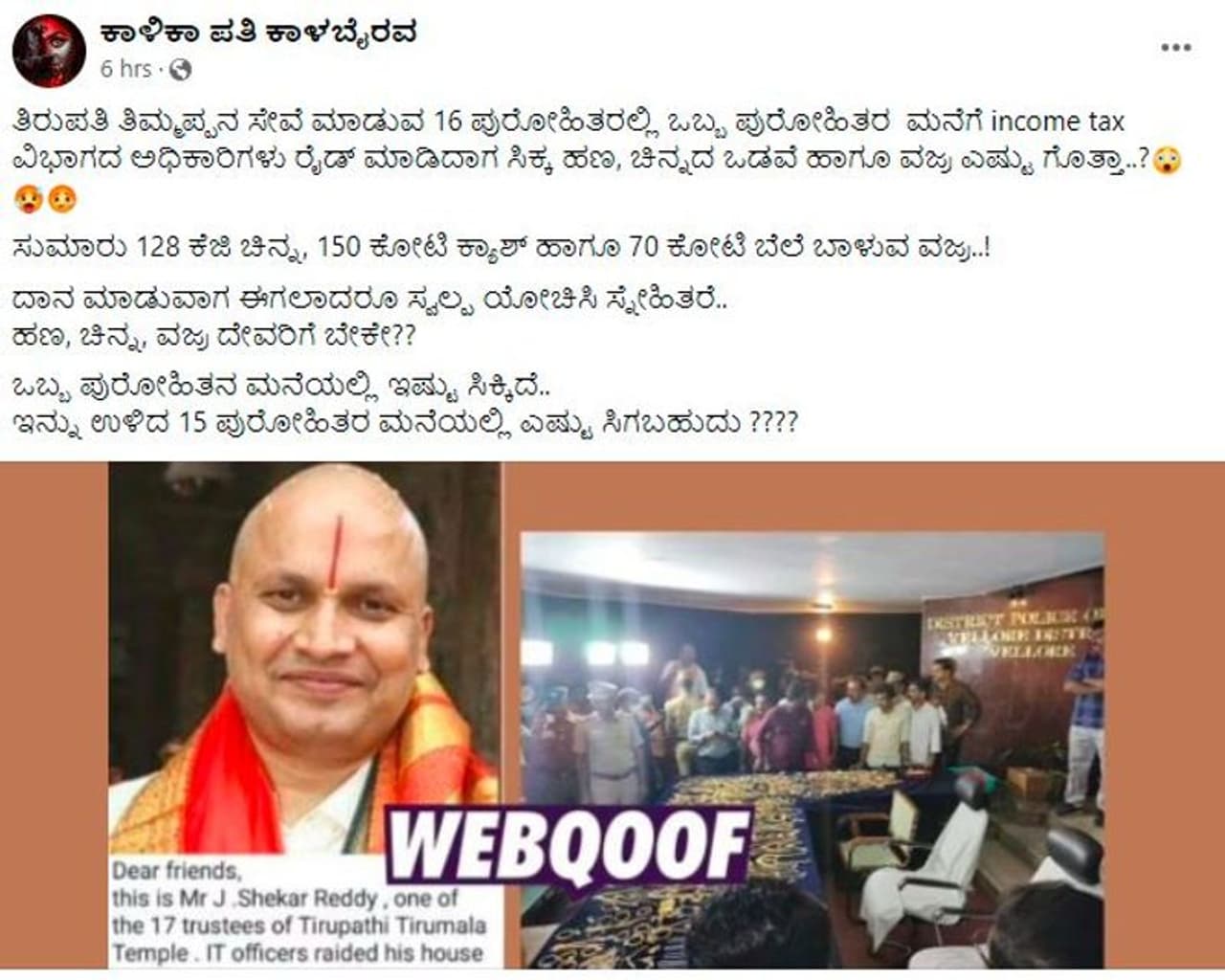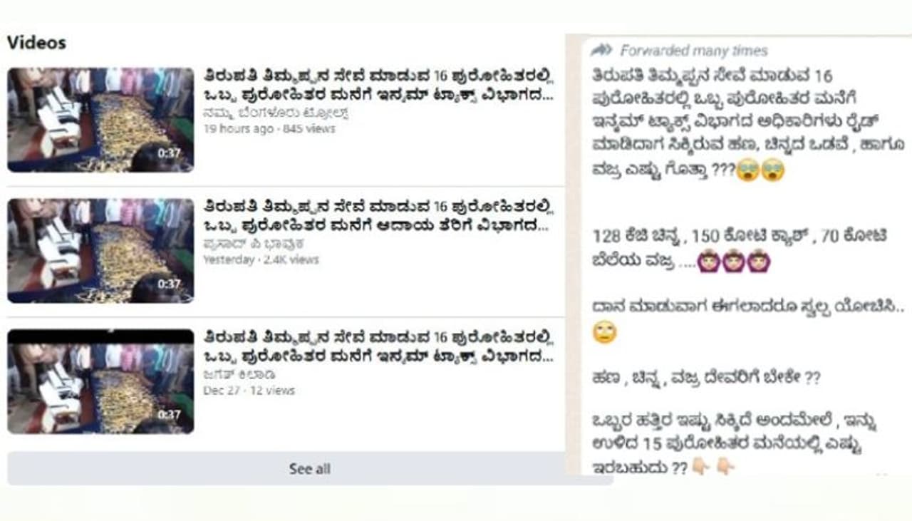 2) "ತಿರುಪತಿ ತಿಮ್ಮಪ್ಪನ ಸೇವೆ ಮಾಡುವ 16 ಪುರೋಹಿತರಲ್ಲಿ ಒಬ್ಬ ಪುರೋಹಿತರ ಮನೆಗೆ ಇನ್ಕಮ್ ಟ್ಯಾಕ್ಸ್ ವಿಭಾಗದ ಅಧಿಕಾರಿಗಳು ರೈಡ್ ಮಾಡಿದಾಗ ಸಿಕ್ಕಿರುವ ಹಣ, ಚಿನ್ನದ ಒಡವೆ , ಹಾಗೂ ವಜ್ರ ಎಷ್ಟು ಗೊತ್ತಾ ???128 ಕೆಜಿ ಚಿನ್ನ , 150 ಕೋಟಿ ಕ್ಯಾಶ್ , 70 ಕೋಟಿ ಬೆಲೆಯ ವಜ್ರ .ದಾನ ಮಾಡುವಾಗ ಈಗಲಾದರೂ ಸ್ವಲ್ಪ ಯೋಚಿಸಿ. ಹಣ , ಚಿನ್ನ , ವಜ್ರ ದೇವರಿಗೆ ಬೇಕೇ ??ಒಬ್ಬರ ಹತ್ತಿರ ಇಷ್ಟು ಸಿಕ್ಕಿದೆ ಅಂದಮೇಲೆ , ಇನ್ನು ಉಳಿದ 15 ಪುರೋಹಿತರ ಮನೆಯಲ್ಲಿ ಎಷ್ಟು ಇರಬಹುದು ??" ಎಂದು ವಿಡಿಯೋ ಹಾಗೂ ಫೋಟೊಗಳ ಜತೆಗೆ ಕನ್ನಡಲ್ಲಿಯೇ ಶೇರ್ ಮಾಡಲಾಗಿದೆ.