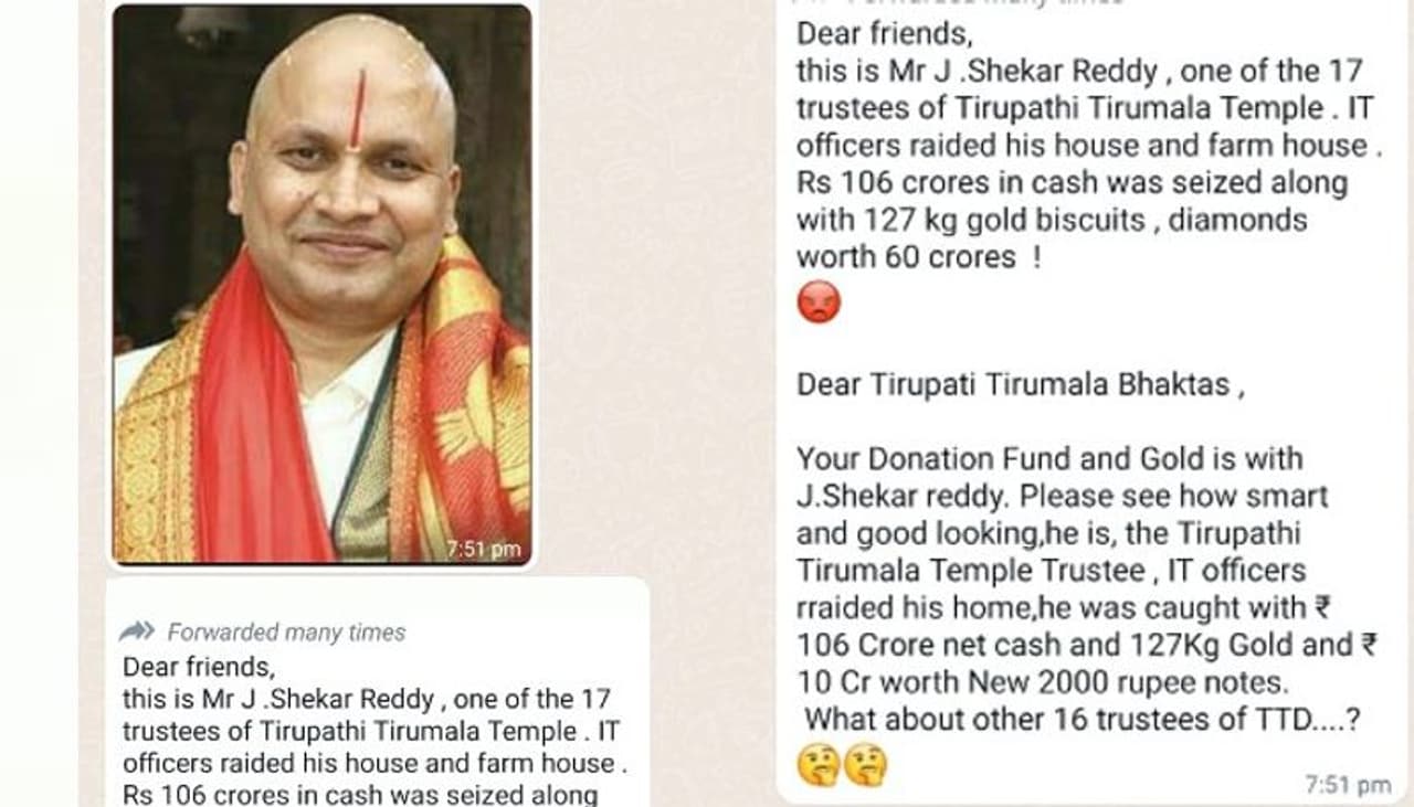 1)"ಆತ್ಮೀಯ ಸ್ನೇಹಿತರೇ, ಇವರು ತಿರುಪತಿ ತಿರುಮಲ ದೇವಸ್ಥಾನದ 17 ಟ್ರಸ್ಟಿಗಳಲ್ಲಿ ಒಬ್ಬರಾದ ಶ್ರೀ ಜೆ ಶೇಖರ್ ರೆಡ್ಡಿ. ಅವರ ಮನೆ ಮತ್ತು ಫಾರ್ಮ್ ಹೌಸ್ ಮೇಲೆ ಐಟಿ ಅಧಿಕಾರಿಗಳು ದಾಳಿ ನಡೆಸಿದ್ದಾರೆ. 60 ಕೋಟಿ ಮೌಲ್ಯದ 127 ಕೆಜಿ ಚಿನ್ನದ ಬಿಸ್ಕೆಟ್, ವಜ್ರ ಸೇರಿದಂತೆ 106 ಕೋಟಿ ನಗದು ವಶ! ಟಿಟಿಡಿಯ ಇತರ 16 ಟ್ರಸ್ಟಿಗಳ ಕತೆ ಏನು? ನೀವು ದಾನ ಮಾಡುವ ಮೊದಲು ಯೋಚಿಸಿ! ಒಂದೋ ಅದನ್ನು ಮತಾಂತರಕ್ಕಾಗಿ ಅಥವಾ ವೈಯಕ್ತಿಕ ಪ್ರಯೋಜನಗಳಿಗಾಗಿ ಬಳಸಲಾಗುತ್ತದೆ" ಎಂದು ಆಂಗ್ಲ ಭಾಷೆಯಲ್ಲಿ ಸಂದೇಶಗಳನ್ನು ಹರಿಬಿಡಲಾಗಿದೆ