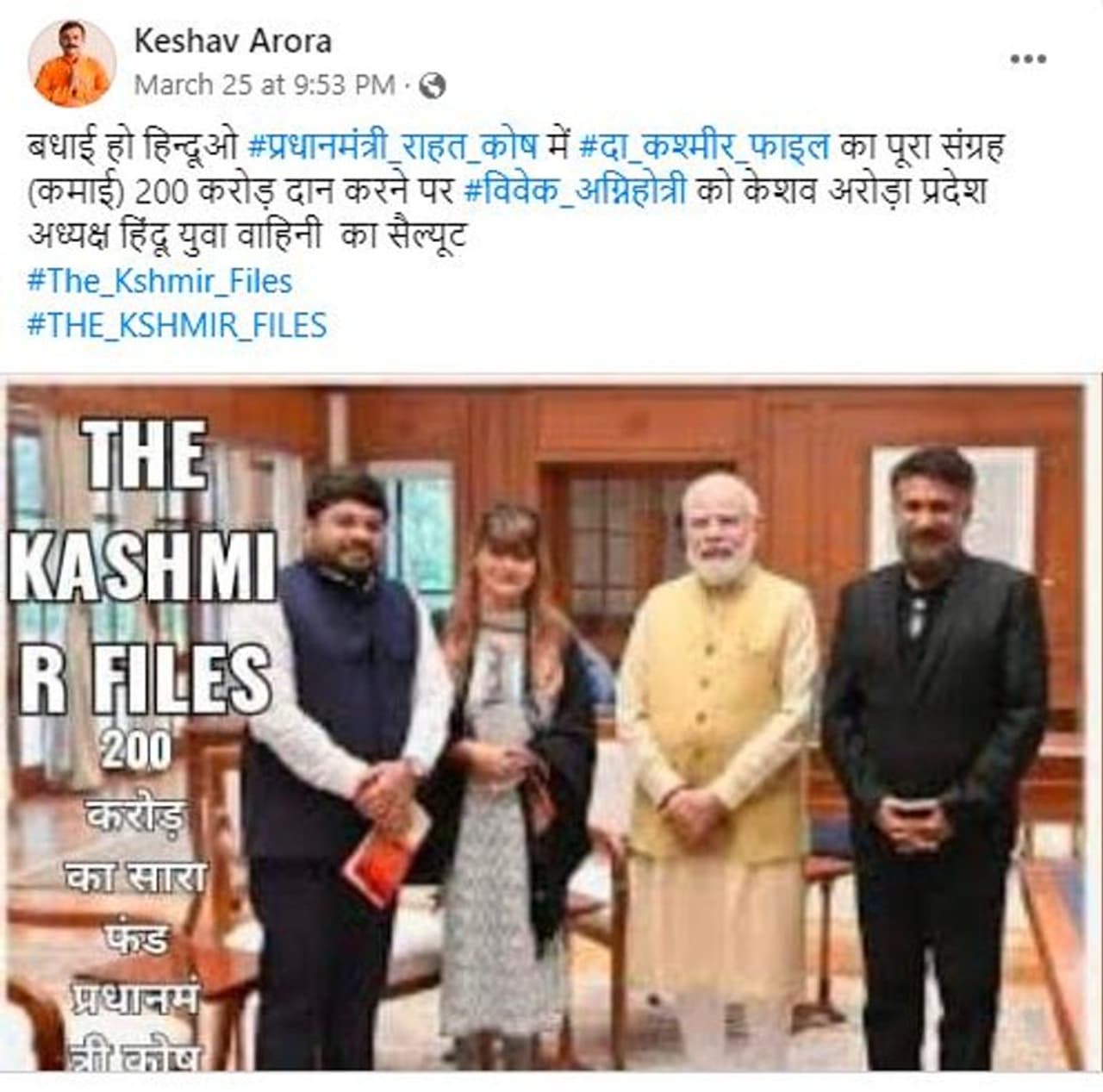 Claim: "ಅಭಿನಂದನೆಗಳು ಹಿಂದೂಗಳೇ, ಪ್ರಧಾನಿ ಪರಿಹಾರ ನಿಧಿಗೆ ದಿ ಕಶ್ಮೀರ ಫೈಲ್ಸ್ 200 ಕೋಟಿಗಳ ಸಂಪೂರ್ಣ ಸಂಗ್ರಹವನ್ನು (ಗಳಿಕೆಯ) ದೇಣಿಗೆ ನೀಡಿದ ವಿವೇಕ್ ಅಗ್ನಿಹೋತ್ರಿಯವರಿಗೆ, ಕೇಶವ ಅರೋರಾ ರಾಜ್ಯಾಧ್ಯಕ್ಷ ಹಿಂದೂ ಯುವ ವಾಹಿನಿಯ ವಂದನೆಗಳು" ಎಂಬ ಹೇಳಿಕೆಯೊಂದಿಗೆ ದಿ ಕಾಶ್ಮೀರ್ ಫೈಲ್ಸ್ ತಂಡವು ಪ್ರಧಾನಿ ನರೇಂದ್ರ ಮೋದಿ ಜತೆಗಿರುವ ಫೋಟೋ ಸಾಮಾಜಿಕ ಜಾಲತಾಣಗಳಲ್ಲಿ ವೈರಲ್ ಮಾಡಲಾಗಿದೆ. ಇದೇ ಮಾದರಿಯಲ್ಲಿ ಹಲವು ಫೋಸ್ಟ್ಗಳು ಫೇಸ್ಬುಕ್ ಸೇರಿದಂತೆ ಸಾಮಾಜಿಕ ಜಾಲತಾಣಗಳಲ್ಲಿ ವೈರಲ್ ಆಗಿವೆ.