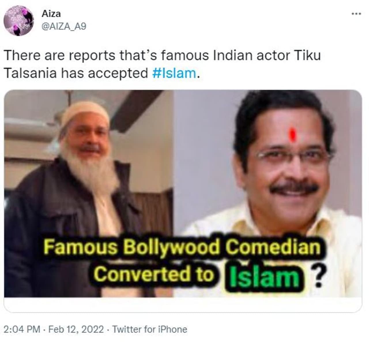 Fact Check: ಪ್ರಸಿದ್ಧ ಹಿಂದಿ ನಟ ಹಾಗೂ ಕನ್ನಡದ ಹಂಬಲ್ ಪೊಲಿಟಿಷಿಯನ್ ನೋಗರಾಜ್ (Humble Politician Nograj) ಚಿತ್ರದಲ್ಲಿ ನಟಿಸಿರುವ ಟಿಕು ತಲ್ಸಾನಿಯಾ (Tiku Talsania) ಇಸ್ಲಾಂ ಧರ್ಮಕ್ಕೆ (Islam) ಮತಾಂತರಗೊಂಡಿದ್ದಾರೆ ಎಂದು ಹೇಳುವ ಚಿತ್ರಗಳ ಕೊಲಾಜ್ ಮತ್ತು ವೀಡಿಯೊವನ್ನು ಸಾಮಾಜಿಕ ಮಾಧ್ಯಮದಲ್ಲಿ (Social Media) ವ್ಯಾಪಕವಾಗಿ ಪ್ರಸಾರ ಮಾಡಲಾಗುತ್ತಿದೆ. ಹಾಸ್ಯನಟ ಟಿಕು ತಲ್ಸಾನಿಯಾ ಅವರ ಕೆಲವು ಚಿತ್ರಗಳು ಸಾಮಾಜಿಕ ಮಾಧ್ಯಮದಲ್ಲಿ ವೈರಲ್ ಆಗುತ್ತಿದ್ದು, ಅದರಲ್ಲಿ ಅವರು ಮುಸ್ಲಿಂ ಟೋಪಿ ಮತ್ತು ಉದ್ದನೆಯ ಗಡ್ಡದೊಂದಿಗೆ ಕಾಣಿಸಿಕೊಂಡಿದ್ದಾರೆ.