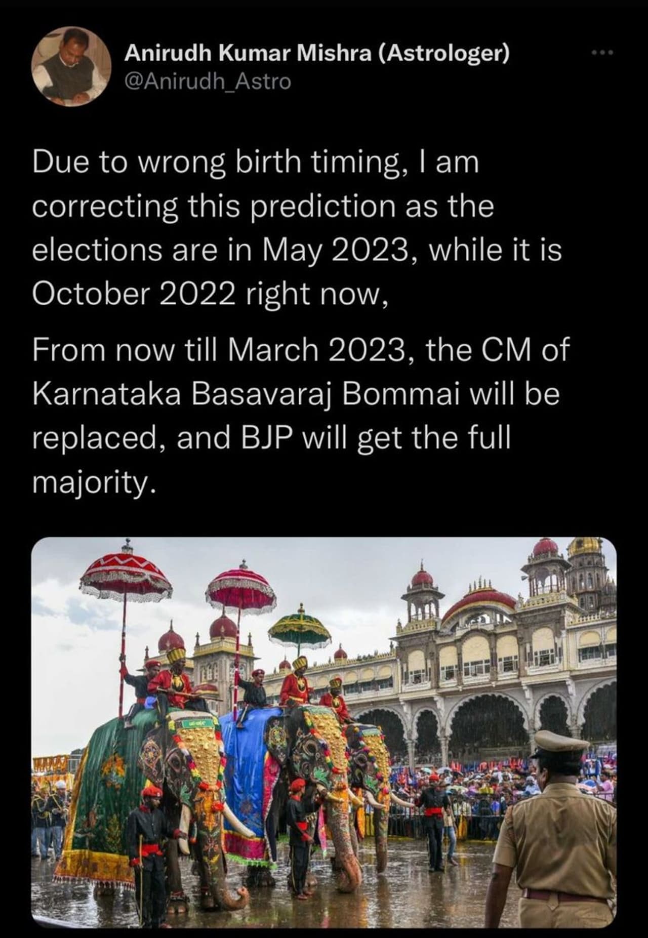 'ಚುನಾವಣೆಗಳು ಮೇ 2023ರಲ್ಲಿ ಇರುವುದರಿಂದ ತಪ್ಪು ಜನನ ಸಮಯದ ಕಾರಣ ಈ ಹಿಂದೆ ಭವಿಷ್ಯ ನುಡಿದಿದ್ದರಲ್ಲಿ ಆಗಿದ್ದ ಪ್ರಮಾದವನ್ನು ನಾನು ಸರಿಪಡಿಸುತ್ತಿದ್ದೇನೆ. ಇದೀಗ ಅಕ್ಟೋಬರ್ 2022 ಆಗಿದೆ. ಇಂದಿನಿಂದ ಮಾರ್ಚ್ 2023ರೊಳಗೆ ಕರ್ನಾಟಕದ ಸಿಎಂ ಬಸವರಾಜ್ ಬೊಮ್ಮಾಯಿ ಅವರನ್ನು ಬದಲಾಯಿಸಲಾಗುತ್ತದೆ ಮತ್ತು ಬಿಜೆಪಿ ಪೂರ್ಣ ಬಹುಮತ ಪಡೆಯುತ್ತದೆ,' ಎಂದು ಮಿಶ್ರಾ ಬುಧವಾರ ಬೆಳಗ್ಗೆ ಟ್ವೀಟ್ ಮಾಡಿದ್ದಾರೆ.