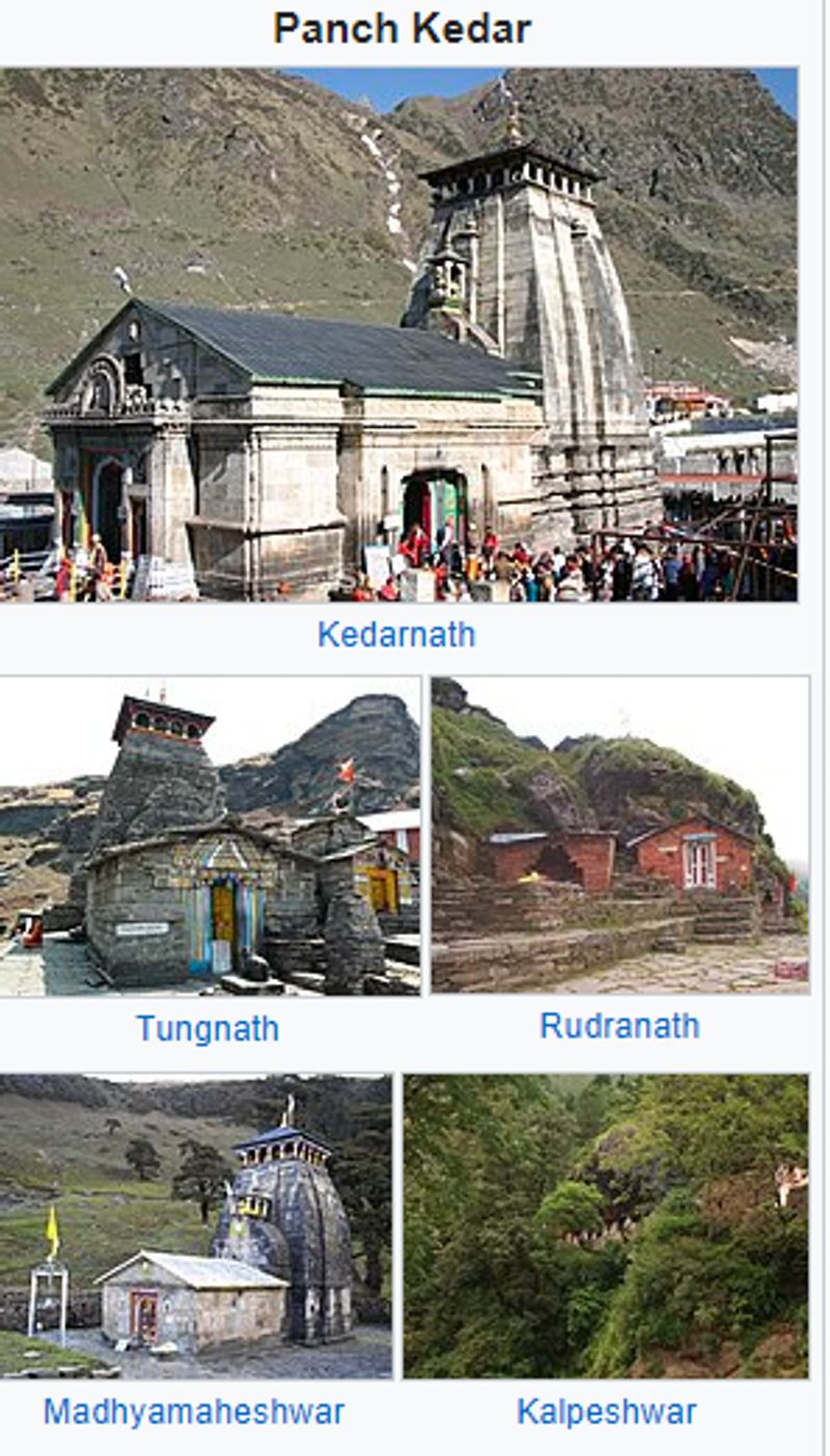 ಮಧ್ಯಮಹೇಶ್ವರ (ಹೊಕ್ಕುಳ ಭಾಗ) - ಶಿವನ ಹೊಕ್ಕುಳ ಹೊರಹೊಮ್ಮಿದ ಈ ತಾಣವು ಅದರ ಪ್ರಶಾಂತ ಸೌಂದರ್ಯಕ್ಕೆ ಹೆಸರುವಾಸಿಯಾಗಿದೆ ಮತ್ತು ಶಿವನ ಮಧ್ಯದ (ಮಧ್ಯ) ಭಾಗವನ್ನು ಲಿಂಗದ ರೂಪದಲ್ಲಿ ಪ್ರತಿನಿಧಿಸಲಾಗುತ್ತದೆ.