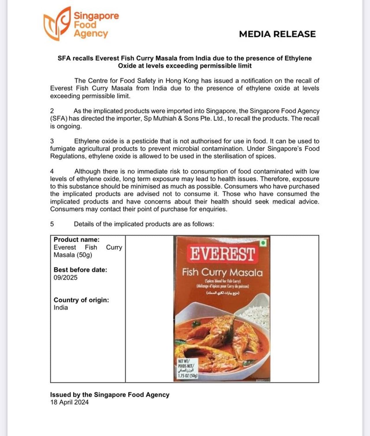 ಸಿಂಗಾಪುರ್ ಫುಡ್ ಏಜೆನ್ಸಿ (ಎಸ್ಎಫ್ಎ) ಗುರುವಾರ ಬಿಡುಗಡೆ ಮಾಡಿದ ಹೇಳಿಕೆಯಲ್ಲಿ, ಉತ್ಪನ್ನಗಳನ್ನು ಹಿಂಪಡೆಯಲು ಆಮದುದಾರರಾದ ಎಸ್ಪಿ ಮುತ್ತಯ್ಯ ಮತ್ತು ಸನ್ಸ್ ಪ್ರೈವೇಟ್ ಲಿಮಿಟೆಡ್ಗೆ ಸಂಸ್ಥೆ ನಿರ್ದೇಶಿಸಿದೆ. ಎಥಿಲೀನ್ ಆಕ್ಸೈಡ್ ಅನ್ನು ಆಹಾರದಲ್ಲಿ ಬಳಸಲು ಅನುಮತಿಸಲಾಗಿಲ್ಲ ಮತ್ತು ಸೂಕ್ಷ್ಮಜೀವಿಯ ಮಾಲಿನ್ಯವನ್ನು ತಡೆಗಟ್ಟಲು ಕೃಷಿ ಉತ್ಪನ್ನಗಳಿಗೆ ಮಾತ್ರವೇ ಇದನ್ನು ಬಳಸಲಾಗುತ್ತದೆ ಎಂದು ಎಸ್ಎಫ್ಎ ಹೇಳಿದೆ. "ಸಿಂಗಾಪುರದ ಆಹಾರ ನಿಯಮಗಳ ಅಡಿಯಲ್ಲಿ, ಎಥಿಲೀನ್ ಆಕ್ಸೈಡ್ ಅನ್ನು ಮಸಾಲೆ ಪದಾರ್ಥಗಳನ್ನು ಬೆಳೆಸುವ ವೇಳೆ ಕ್ರಿಮಿನಾಶಕದಲ್ಲಿ ಬಳಸಲು ಅನುಮತಿಸಲಾಗಿದೆ" ಎಂದು ಎಸ್ಎಫ್ಎ ತಿಳಿಸಿದೆ.