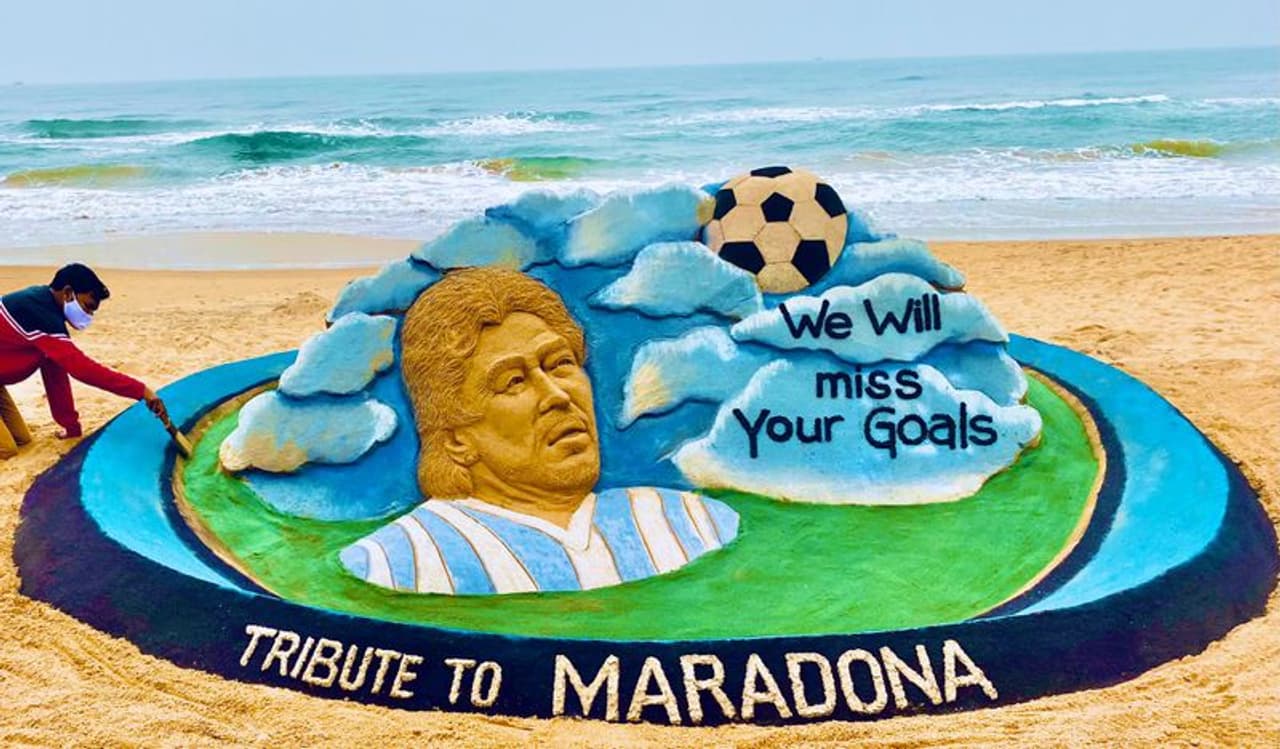ಪುಟ್ಬಾಲ್ ದಿಗ್ಗಜ ಮರಡೋನಾಗೆ ಸುದರ್ಶನ್ ಪಟ್ನಾಯಕ್ ಮರಳು ಶಿಲ್ಪದ ಗೌರವ ನಮನ!