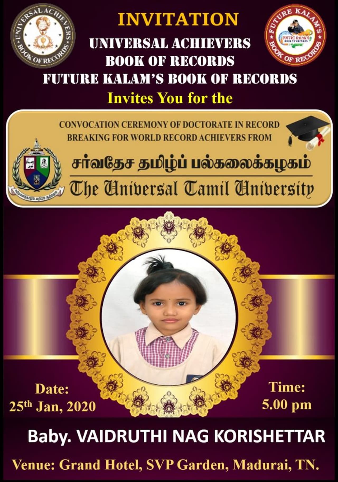 ಚಿಕ್ಕ ವಯಸ್ಸಿನಲ್ಲಿ ಕುಮಾರಿ ವೈದ್ರುತಿ ನಾಗ್ ಕೋರಿಶೆಟ್ಟರ್ ಸಾಧನೆಯನ್ನು ಪರಿಗಣಿಸಿದ ತಮಿಳುನಾಡಿನ ಯೂನಿವರ್ಸಲ್ ವಿಶ್ವವಿದ್ಯಾಲಯ ಗೌರವ್ ಡಾಕ್ಟರೇಟ್ ಪ್ರಶಸ್ತಿಗೆ ಆಯ್ಕೆ ಮಾಡಿದೆ. 7ನೇ ವಯಸ್ಸಿಗೆ ಡಾಕ್ಟರೇಟ್ ಗೌರವಕ್ಕೆ ಪಾತ್ರರಾಗೋ ಮೂಲಕ ವೈದ್ರುತಿ ಗದಗ ಮಾತ್ರವಲ್ಲ ಕರ್ನಾಟಕವೇ ಹೆಮ್ಮೆ ಪಡುವ ಸಾಧನೆ ಮಾಡಿದ್ದಾಳೆ.