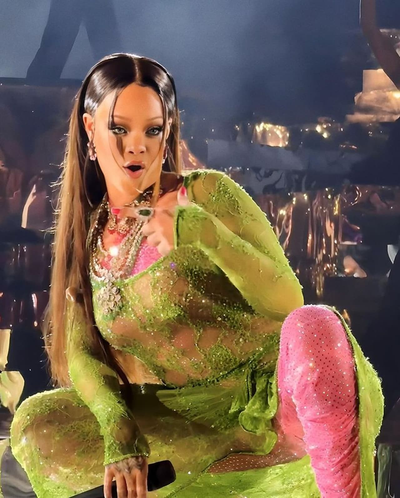 ಈ ಪಾಪ್ ಗಾಯಕಿ ತನ್ನ ಗಾಯನ ಮತ್ತು ವೇದಿಕೆಯಯಲ್ಲಿ ಡಾನ್ಸ್ನಿಂದ ಎಲ್ಲರನ್ನೂ ಆಕರ್ಷಿಸಿದ್ದು, ಈ ಅದ್ಭುತ ಪ್ರದರ್ಶನದ ಸೆಟ್ಟಿಂಗ್ ಅನ್ನು ಬಹಳ ಅದ್ದೂರಿಯಾಗಿ ಯೋಜಿಸಲಾಗಿತ್ತು. ರಿಹಾನ್ನಾ ಈ ಅದ್ದೂರಿ ಪ್ರದರ್ಶನಕ್ಕಾಗಿ ಪಾರದರ್ಶಕವೆನಿಸುವ ಮಿರಿ ಮಿರಿ ಮಿಂಚುವ ಸೈಡ್ ತೆರೆದಿರುವಂತೆಹ ಬಟ್ಟೆಯನ್ನು ಧರಿಸಿದ್ದರು.