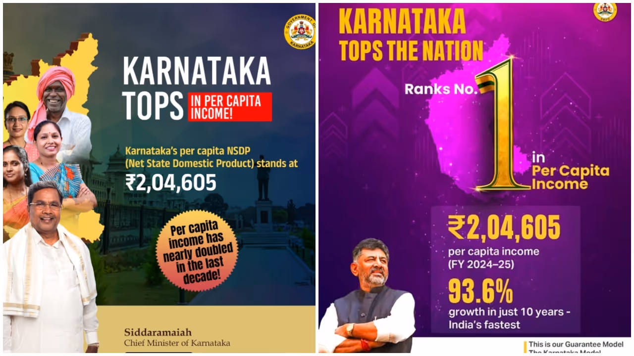 ಹಣಕಾಸು ಸಚಿವಾಲಯವು ಲೋಕಸಭೆಯಲ್ಲಿ ಮಂಡಿಸಿದ ಹೊಸ ಅಂಕಿಅಂಶಗಳ ಪ್ರಕಾರ, 2024–25ನೇ ಹಣಕಾಸು ವರ್ಷದಲ್ಲಿ ಕರ್ನಾಟಕವು ದೇಶದಲ್ಲಿ ಅತಿ ಹೆಚ್ಚು ತಲಾ ಆದಾಯ ಹೊಂದಿರುವ ರಾಜ್ಯವಾಗಿ ಹೊರಹೊಮ್ಮಿದ್ದು, ತಲಾ ಆದಾಯ ₹2 ಲಕ್ಷದ ಗಡಿಯನ್ನು ದಾಟಿದೆ. ಸ್ಥಿರ ಬೆಲೆಯಲ್ಲಿ ಕರ್ನಾಟಕದ ತಲಾ ನಿವ್ವಳ ರಾಜ್ಯ ದೇಶೀಯ ಉತ್ಪನ್ನ (NSDP) ₹2,04,605 ತಲುಪಿದ್ದು, 2014–15ರಲ್ಲಿ ಇದು ₹1,05,697 ಇದ್ದುದರಿಂದ, ರಾಜ್ಯವು ದಶಕದಲ್ಲಿ 93.6%ರಷ್ಟು ಬೆಳವಣಿಗೆ ಕಂಡಿದೆ.