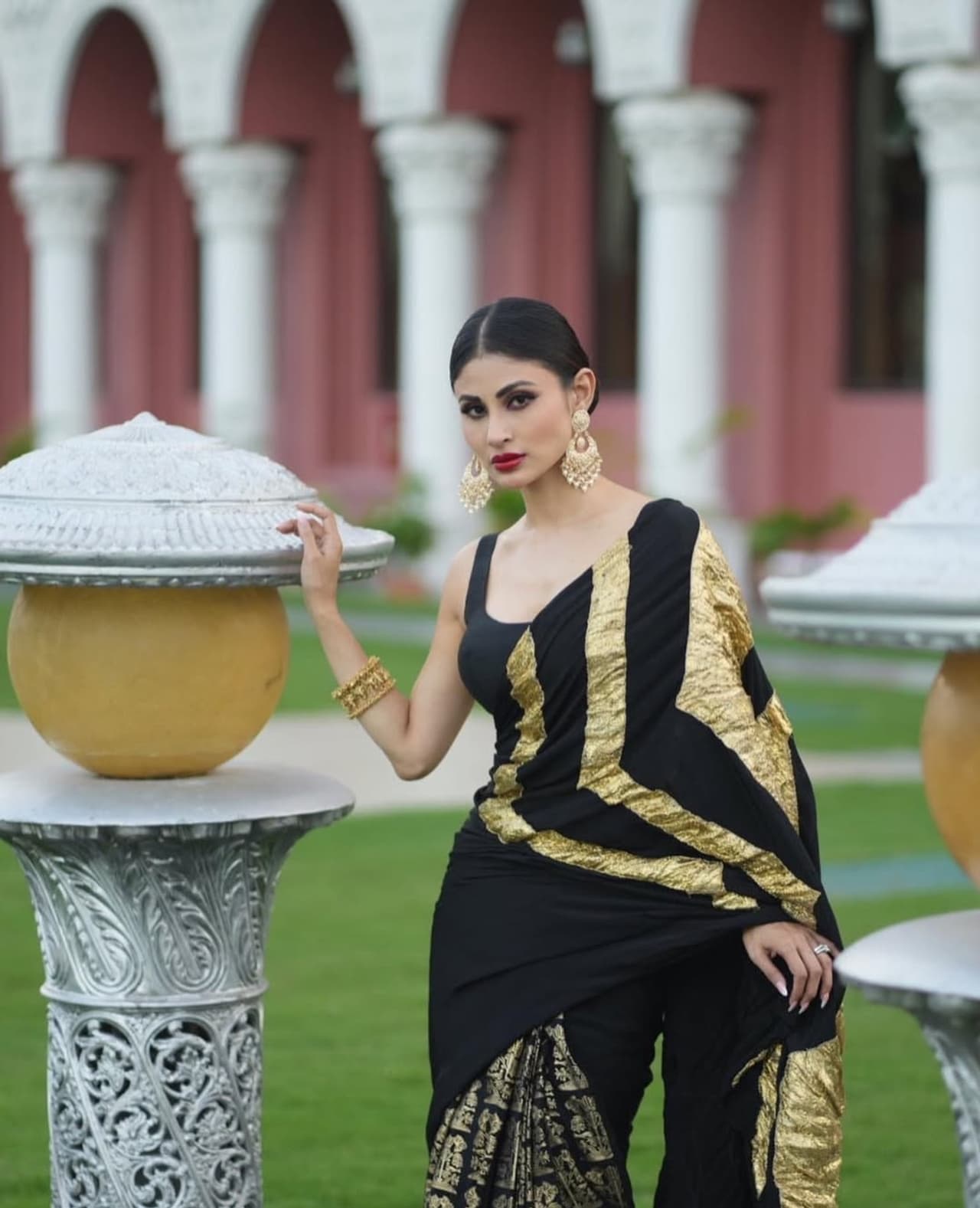 ಈ ಫೋಟೊದಲ್ಲಿ ಸ್ಲಿಮ್ ಬ್ಯೂಟಿ ಮೌನಿ ರಾಯ್ ಕೆಂಪು ಅಂಚು ಹೊಂದಿರುವ ಕಪ್ಪು ಸೀರೆಯೊಂದಿಗೆ ಸ್ಲೀವ್ ಲೆಸ್ ಬ್ಲೌಸ್ ನಲ್ಲಿ ಕಾಣಿಸಿಕೊಂಡಿದ್ದಾರೆ. ಅದರಲ್ಲಿ ನಟಿ ಒಂದು ಕೈಯಲ್ಲಿ ಕೆಂಪು ಬಳೆಗಳನ್ನು ಧರಿಸುವ ಮೂಲಕ ತನ್ನ ಟ್ರೆಡಿಶನಲ್ ಲುಕ್ ಗೆ ಗ್ಲಾಮರಸ್ ಟಚ್ ಕೊಟ್ಟಿದ್ದಾರೆ.