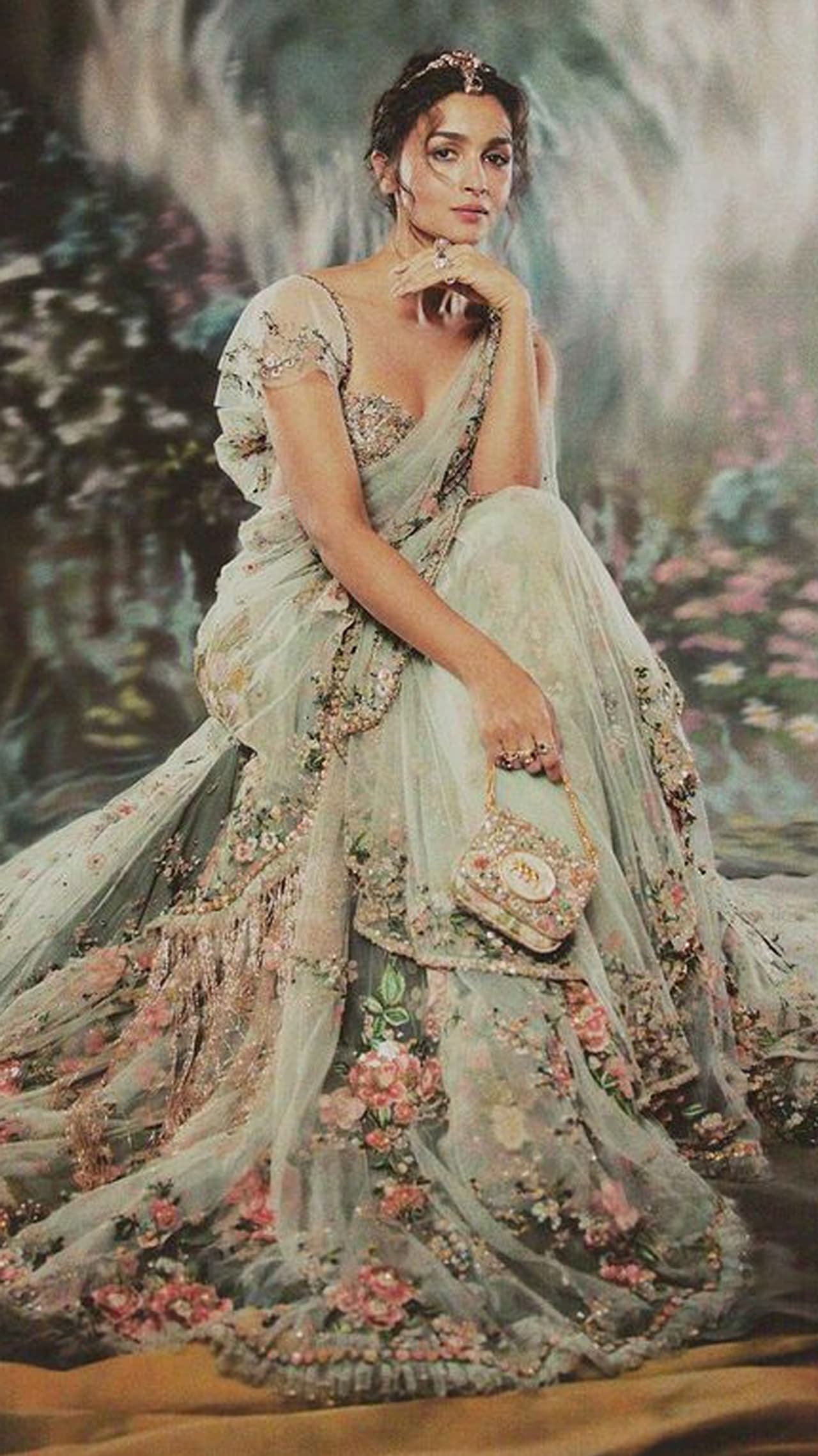 ಈ ಬಾರಿ ಆಲಿಯಾ ಎರಡನೇ ಬಾರಿ ಈ ಕಾರ್ಯಕ್ರಮದಲ್ಲಿ ಭಾಗವಹಿಸಿದ್ದು, ಪಿಸ್ತಾ ಹಸಿರು ಬಣ್ಣದ 3D ಹೂವಿನ ಸಬ್ಯಸಾಚಿ ಸೀರೆ ಧರಿಸಿದ್ದರು. ರೇಷ್ಮೆಯ ಫ್ಲೋಸ್, ಮಣಿಗಳು, ಮಿನುಗುಗಳು ಮತ್ತು ಫ್ರಿಂಜ್ಡ್ ಗ್ಲಾಸ್ ಮಣಿಗಳ ಜೊತೆಗೆ ಅಮೂಲ್ಯವಾದ ಹರಳುಗಳನ್ನು ಸೇರಿಸಿ ಕೈಯಿಂದಲೇ ಕಸೂತಿ ಮಾಡಿ ತಯಾರಿಸಿದ ಸೀರೆ ಇದಾಗಿತ್ತು.