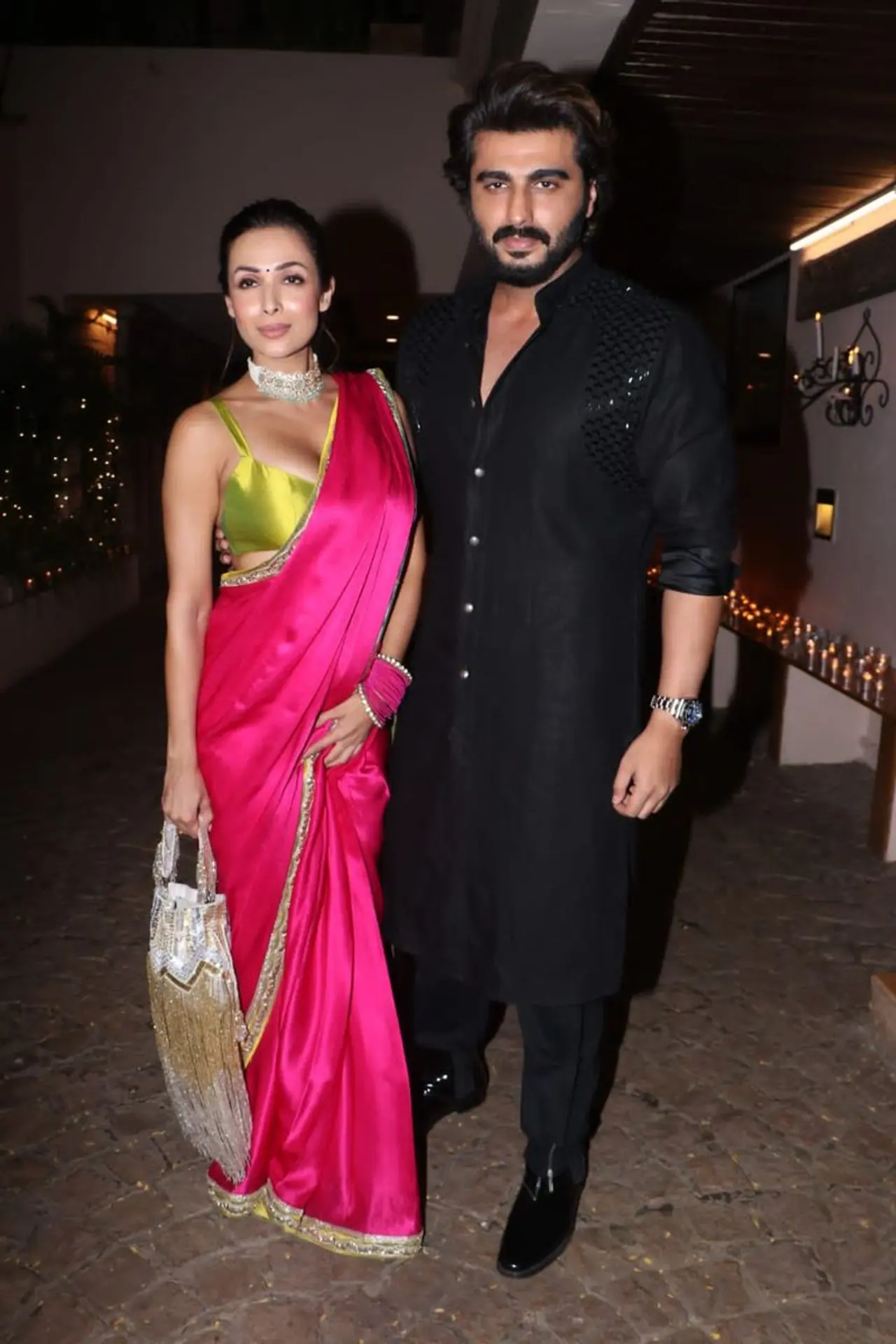 ಮಲೈಕಾ ಮತ್ತು ಅರ್ಜುನ್ ಅವರು ಒಟ್ಟಿಗೆ ಭಾಗವಹಿಸುವ ಯಾವುದೇ ಕಾರ್ಯಕ್ರಮಗಳು ಅಥವಾ ಪಾರ್ಟಿಗಳ ಸಮಯದಲ್ಲಿ ಎಲ್ಲಾ ಗಮನ ಮತ್ತು ಕ್ಯಾಮರಾ ಯಾವಾಗಲೂ ಅವರ ಮೇಲೆ ಇರುತ್ತದೆ. ದೀಪಾವಳಿ ಪಾರ್ಟಿಯಲ್ಲಿ ಮಲೈಕಾ ಹಾಟ್ ಪಿಂಕ್ ಸ್ಯಾಟಿನ್ ಸೀರೆಗೆ ಹಸಿರು ಪಟ್ಟಿಯ ಬ್ಲೌಸ್ ಧರಿಸಿದ್ದರು.