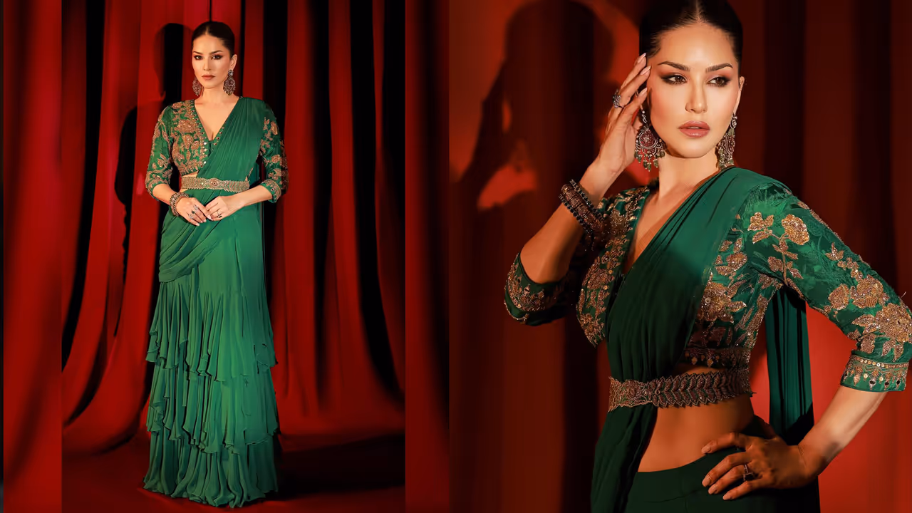 ಹಸಿರು ರಫಲ್ ಸೀರೆ: ಸನ್ನಿ ಲಿಯೋನ್ ಹಸಿರು ಬಣ್ಣದ ಸೀರೆಯಲ್ಲಿ ಅದ್ಭುತವಾಗಿ ಕಾಣುತ್ತಿದ್ದಾರೆ. ರಫಲ್ ಸೀರೆಯನ್ನು ನೀವು ಯಾವುದೇ ಸಂದರ್ಭದಲ್ಲಿ ಧರಿಸಬಹುದು. ಇದು ಲೆಹೆಂಗಾ ಕೊರತೆಯನ್ನು ಸಹ ಪೂರೈಸುತ್ತದೆ. ಈ ರೀತಿಯ ಸೀರೆ ನಿಮಗೆ 2-3 ಸಾವಿರದೊಳಗೆ ಸಿಗುತ್ತದೆ.