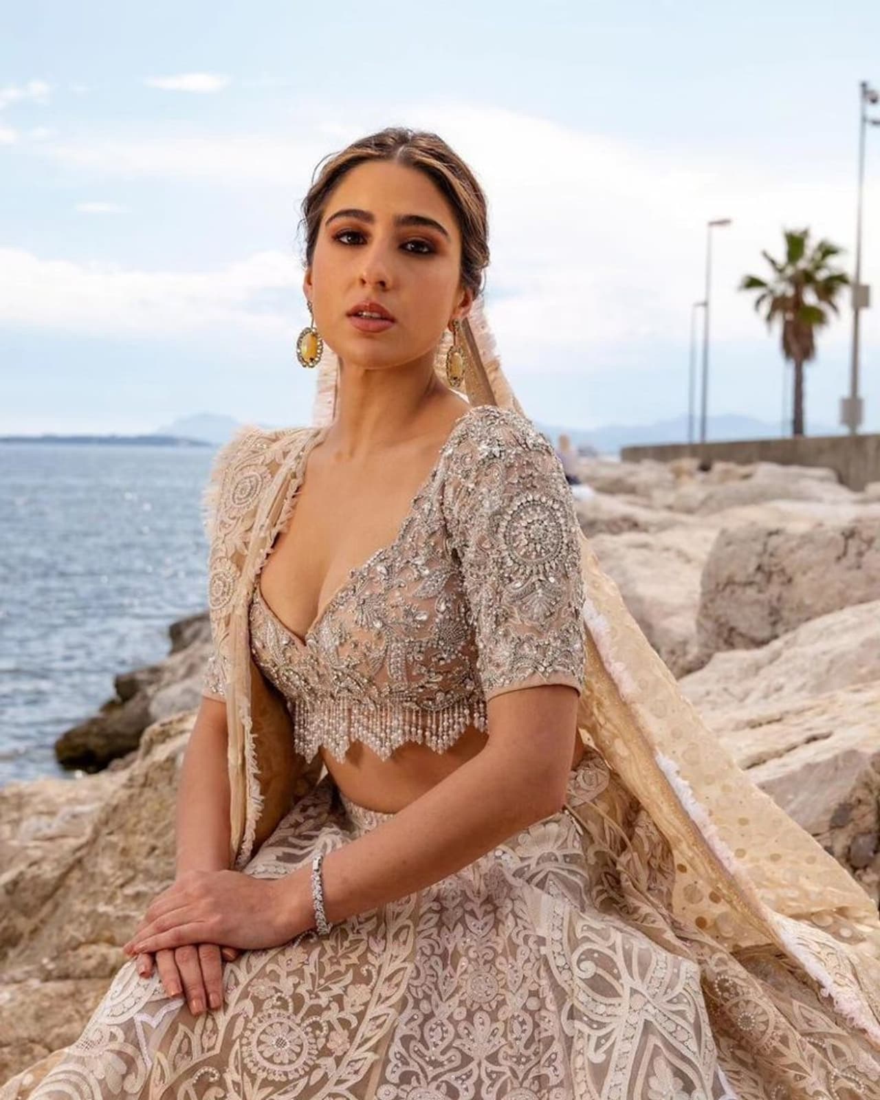 ನಟಿ ಸಾರಾ ಅಲಿ ಖಾನ್ ದೇಸಿ ಲುಕ್ನಲ್ಲಿ ಕಾಣಿಸಿಕೊಂಡಿದ್ದಾರೆ. ಖ್ಯಾತ ಡಿಸೈನರ್ ಅಬು ಜಾನಿ ಮತ್ತು ಸಂದೀಪ್ ಖೋಸ್ಲಾ ಡಿಸೈನ್ ಮಾಡಿದ ಲೆಹಂಗಾ ಇದಾಗಿದೆ. ರೆಡ್ ಕಾರ್ಪೆಟ್ ಮೇಲೆ ಮೊದಲ ಬಾರಿಗೆ ಹೆಜ್ಜೆ ಹಾಕಿದ ನಟಿಯರು ಫುಲ್ ಖುಷ್ ಆಗಿದ್ದಾರೆ.