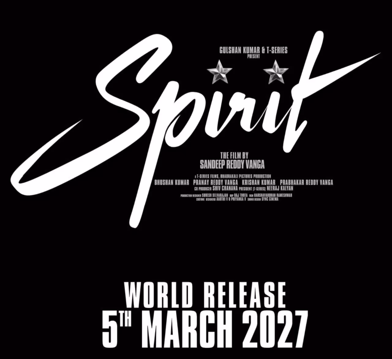 ಈ ವರ್ಷದ ಆರಂಭದಲ್ಲಿ ಟಿ-ಸೀರೀಸ್ ಎಂಬ ತಯಾರಕರು ಸ್ಪಿರಿಟ್ ಮಾರ್ಚ್ 5, 2027 ರಂದು ವಿಶ್ವಾದ್ಯಂತ ಚಿತ್ರಮಂದಿರಗಳಲ್ಲಿ ಬಿಡುಗಡೆಯಾಗಲಿದೆ ಎಂದು ಘೋಷಿಸಿದರು. ಪ್ರಭಾಸ್ ಪೊಲೀಸ್ ಪಾತ್ರದಲ್ಲಿ ನಟಿಸಲಿದ್ದಾರೆ, ಚಿತ್ರದಲ್ಲಿ ವಿವೇಕ್ ಒಬೆರಾಯ್ ಮತ್ತು ಕಾಂಚನಾ ಪ್ರಮುಖ ಪಾತ್ರಗಳಲ್ಲಿ ನಟಿಸಿದ್ದಾರೆ. ಈ ಚಿತ್ರಗಳು ಪ್ರಭಾಸ್ ಮತ್ತು ಸಂದೀಪ್ ರೆಡ್ಡಿ ವಂಗಾ ನಡುವಿನ ಮೊದಲ ಸಹಯೋಗವನ್ನು ಗುರುತಿಸುತ್ತವೆ.