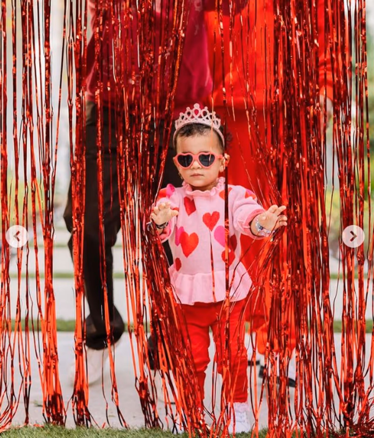ಈ ಪಾರ್ಟಿಗಾಗಿ ಪುಟಾಣಿ ಮಾಲ್ತಿಗೆ ಪಿಂಕ್ ಬಣ್ಣದ ಉಡುಗೆ ಮತ್ತು ಹಾರ್ಟ್ ಶೇಪಿನ ಕನ್ನಡಕಗಳನ್ನು ಹಾಕಲಾಗಿದೆ. ತಲೆಯ ಮೇಲೆ ಕಿರೀಟವೂ ಇದೆ.