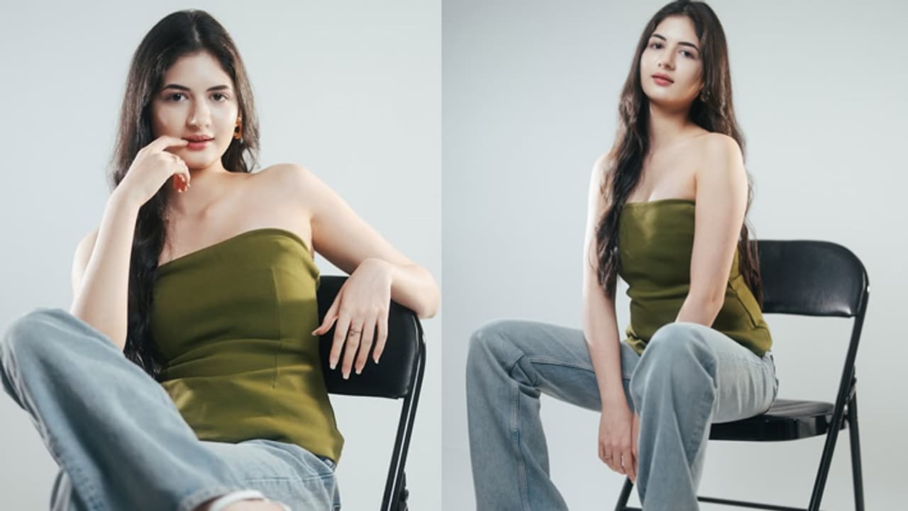 ಫೋಟೋಗಳಲ್ಲಿ ಹರ್ಷಾಲಿ ಬ್ಲೂ ಜೀನ್ಸ್ ಮತ್ತು ಗ್ರೀನ್ ಟಾಪ್ ಹಾಕೊಂಡು ಚೇರ್ ಮೇಲೆ ಕೂತು ಸ್ಟೈಲಿಶ್ ಆಗಿ ಪೋಸ್ ಕೊಟ್ಟಿದಾರೆ.